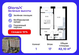 Продается 1-комн. квартира на 17-м этаже в жилом квартале GloraX Зелёные высоты — проекте в тихой зелёной локации. Общая площадь квартиры 42,10 кв. м, из которых 12,50 кв. м включая 12,50 кв. м жилого пространства и 14,00 кв. м кухни. Номер квартиры - 424.Преимущества квартиры:просторная евро-2, лоджия, гардеробная.Преимущества проекта:• Идеальное сочетание городской и загородной жизни• Сдаем в 2025 году• Уютный зелёный район с развитой инфраструктурой• Великолепные виды на Вечнозеленый сквер и лесопарк на 150 Га• Видеонаблюдение, IP-домофон, Wi-Fi на территории,• Дизайнерские входные группы• Безбарьерная среда, колясочные, туалеты на 1 этаже, лапомойки• Эксклюзивное благоустройство территории • Подземный паркинг на 235 машино-мест с лифтом на жилые этажи• Индивидуальные кладовые от 3 до 7 кв. м• Черновая отделка для реализации любых дизайнерских идейGloraX Зелёные высоты — современный жилой проект, сочетающий преимущества городской и пригородной жизни. Комплекс тщательно продуман для максимального удобства и обеспечения безопасности жителей. Квартал расположен в зеленом, живописном и активно развивающемся районе Зеленый Угол, вдали от серой массовой застройки. Жители GloraX Зелёные высоты смогут насладждаться прогулками в Вечнозелёном сквере или лесопарке. В непосредственной близости находятся остановки общественного транспорта и автомобильный подъезд со стороны Нейбута. Скоро также появится выездом на трассу Де-Фриз-Седанка, что обеспечит быстрый доступ в любую часть города и пригород.Проект включает 2 корпуса, каждый из которых спроектирован с акцентом на комфорт, безопасность и современный образ жизни.В комплексе предусмотрен подземный паркинг на 235 машиномест с доступом прямо с жилых этажей. Паркинг оборудован современными системами видеонаблюдения, контроля въезда-выезда и пожаротушения. Цокольный этаж здания отведен под индивидуальные кладовые площадью от 3 до 7 квадратных метров, которые можно использовать для хранения сезонных вещей. Доступ к кладовым - на лифте с жилых этажей.Территория жилого квартала благоустроена и включает игровые зоны и спортивные площадки для детей различных возрастных групп, уютные зоны отдыха со скамейками и универсальную воркаут-площадку для активного досуга.В шаговой доступности располагаются все необходимые объекты социальной инфраструктуры.Узнайте больше в отделе продаж — выберите свою квартиру в GloraX Зелёные высоты уже сегодня!