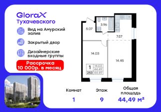 Продается 1-комн. квартира на 14-м этаже в квартале GloraX Клубный. GloraX Клубный - уникальный видовой проект с выделяющейся архитектурой в развитом районе Владивостока. Общая площадь лота составляет 32,46 кв. м, из которых 9,65 кв. м отведено под жилую и 11,93 кв. м под кухонную зону. Номер квартиры - 382.Преимущества квартиры:однокомнатная квартира, высокий этаж.Преимущества проекта:• Квартиры с панорамными видами на бухту Патрокл, маяк Басаргина и остров Русский• Планировочные решения под любой жизненный сценарий от 23 до 67 м²• Гардеробные комнаты, увеличенные панорамные окна, просторные кухни-гостиные• Эксклюзивное благоустройство: продуманное зонирование, игровые и спортивные площадки, площадка для стритбола, амфитеатр• Премиальный дизайн входных групп с лаунж-зоной• Безбарьерная среда, закрытая территория, видеонаблюдение• Лапомойки, колясочные и туалеты на первом этаже• Двухуровневый подземный паркинг на 350 машино-мест с лифтом на жилые этажи• Келлеры на цокольном этаже для хранения сезонных вещей с доступом на лифте• Современный ландшафтный дизайн комплекса от DEREVOPARKGloraX Клубный заповедник в черте мегаполиса. Комплекс тщательно продуман для максимального удобства и обеспечения безопасности его жителей. Квартал расположен в одном из самых современных развивающихся районов города: совсем рядом раскинулась живописная бухта Патрокл, где можно прогуляться по облагороженной пешеходной набережной, заглянуть на пляж или в школу серфинга. Комплекс имеет прекрасную транспортную доступность: рядом проходит объездная трасса СеданкаПатрокл, а до центар можно доехать всего за 15 минут.Проект включает 3 монолитных корпуса, каждый из которых спроектирован с акцентом на комфорт, безопасность и современный образ жизни рядом с уникальной природой. Общий двор создает приватную территорию для житей комплекса.В комплексе предусмотрен двухуровневый подземный паркинг на 350 машино-мест с доступом прямо с жилых этажей. Паркинг оборудован современными системами видеонаблюдения, контроля въезда-выезда и пожаротушения. На цокольном этаже размещаются келлеры для хранения сезонных и габаритных вещей. Доступ к кладовым на лифте с жилых этажей. Современный ландшафтный дизайн жилого комплекса GloraX Клубный создан ведущей российской студией DEREVOPARK. Во дворе для детей всех возрастов предусмотрены различные игровые площадки с лазалками, батутами, качелями и песочницей. В центре расположен специальный ''зеленый остров'', где взрослые могут отдохнуть на качелях и гамаках в тени больших деревьев. Для любителей спорта предусмотрены две специальные спортивные площадки для настольного тенниса и стритбола — для зрителей тоже найдется место! А еще на территории комплекса будет дорожка для роллеров и любителей покататься на велосипеде, самокате или скейте.В шаговой доступности располагаются все необходимые объекты социальной и коммерческой инфраструктуры.Цена указана при 100