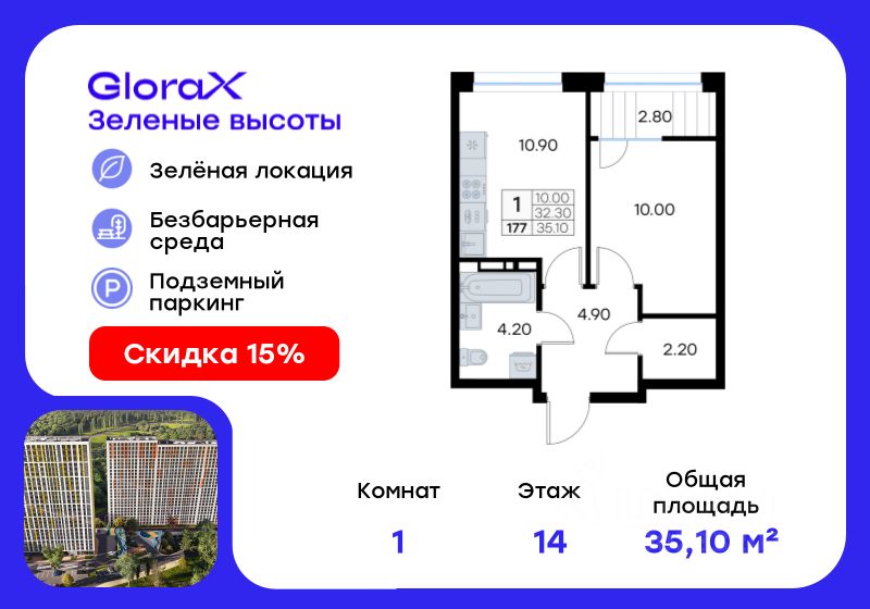 Продается 1-комн. квартира на 14-м этаже в жилом квартале GloraX Зелёные высоты — проекте в тихой зелёной локации. Общая площадь квартиры 35,10 кв. м, из которых 10,00 кв. м включая 10,00 кв. м жилого пространства и 10,90 кв. м кухни. Номер квартиры - 177. Преимущества квартиры: компактная 1 к.кв., лоджия, гардеробная. Преимущества проекта: • Идеальное сочетание городской и загородной жизни • Сдаем в 2025 году • Уютный зелёный район с развитой инфраструктурой • Великолепные виды на Вечнозеленый сквер и лесопарк на 150 Га • Видеонаблюдение, IP-домофон, Wi-Fi на территории, • Дизайнерские входные группы • Безбарьерная среда, колясочные, туалеты на 1 этаже, лапомойки • Эксклюзивное благоустройство территории • Подземный паркинг на 235 машино-мест с лифтом на жилые этажи • Индивидуальные кладовые от 3 до 7 кв. м • Черновая отделка для реализации любых дизайнерских идей GloraX Зелёные высоты — современный жилой проект, сочетающий преимущества городской и пригородной жизни. Комплекс тщательно продуман для максимального удобства и обеспечения безопасности жителей. Квартал расположен в зеленом, живописном и активно развивающемся районе Зеленый Угол, вдали от серой массовой застройки. Жители GloraX Зелёные высоты смогут насладждаться прогулками в Вечнозелёном сквере или лесопарке. В непосредственной близости находятся остановки общественного транспорта и автомобильный подъезд со стороны Нейбута. Скоро также появится выездом на трассу Де-Фриз-Седанка, что обеспечит быстрый доступ в любую часть города и пригород. Проект включает 2 корпуса, каждый из которых спроектирован с акцентом на комфорт, безопасность и современный образ жизни. В комплексе предусмотрен подземный паркинг на 235 машиномест с доступом прямо с жилых этажей. Паркинг оборудован современными системами видеонаблюдения, контроля въезда-выезда и пожаротушения. Цокольный этаж здания отведен под индивидуальные кладовые площадью от 3 до 7 квадратных метров, которые можно использовать для хранения сезонных вещей. Доступ к кладовым - на лифте с жилых этажей. Территория жилого квартала благоустроена и включает игровые зоны и спортивные площадки для детей различных возрастных групп, уютные зоны отдыха со скамейками и универсальную воркаут-площадку для активного досуга. В шаговой доступности располагаются все необходимые объекты социальной инфраструктуры. Узнайте больше в отделе продаж — выберите свою квартиру в GloraX Зелёные высоты уже сегодня!