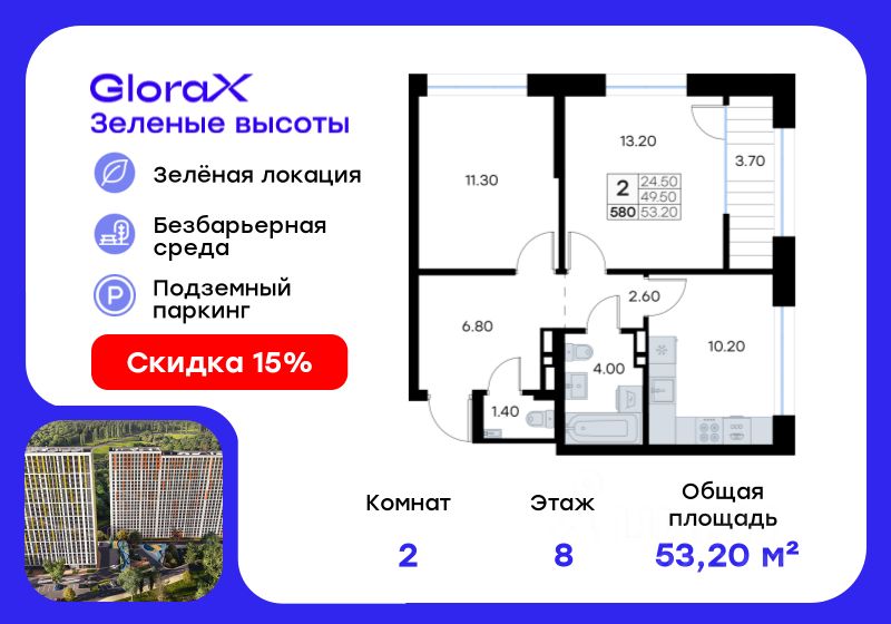 Продается 2-комн. квартира на 8-м этаже в жилом квартале GloraX Зелёные высоты — проекте в тихой зелёной локации. Общая площадь квартиры 53,20 кв. м, из которых 24,50 кв. м включая 24,50 кв. м жилого пространства и 10,20 кв. м кухни. Номер квартиры - 580. Преимущества квартиры: угловая 2 к.кв., лоджия. Преимущества проекта: • Идеальное сочетание городской и загородной жизни • Сдаем в 2025 году • Уютный зелёный район с развитой инфраструктурой • Великолепные виды на Вечнозеленый сквер и лесопарк на 150 Га • Видеонаблюдение, IP-домофон, Wi-Fi на территории, • Дизайнерские входные группы • Безбарьерная среда, колясочные, туалеты на 1 этаже, лапомойки • Эксклюзивное благоустройство территории • Подземный паркинг на 235 машино-мест с лифтом на жилые этажи • Индивидуальные кладовые от 3 до 7 кв. м • Черновая отделка для реализации любых дизайнерских идей GloraX Зелёные высоты — современный жилой проект, сочетающий преимущества городской и пригородной жизни. Комплекс тщательно продуман для максимального удобства и обеспечения безопасности жителей. Квартал расположен в зеленом, живописном и активно развивающемся районе Зеленый Угол, вдали от серой массовой застройки. Жители GloraX Зелёные высоты смогут насладждаться прогулками в Вечнозелёном сквере или лесопарке. В непосредственной близости находятся остановки общественного транспорта и автомобильный подъезд со стороны Нейбута. Скоро также появится выездом на трассу Де-Фриз-Седанка, что обеспечит быстрый доступ в любую часть города и пригород. Проект включает 2 корпуса, каждый из которых спроектирован с акцентом на комфорт, безопасность и современный образ жизни. В комплексе предусмотрен подземный паркинг на 235 машиномест с доступом прямо с жилых этажей. Паркинг оборудован современными системами видеонаблюдения, контроля въезда-выезда и пожаротушения. Цокольный этаж здания отведен под индивидуальные кладовые площадью от 3 до 7 квадратных метров, которые можно использовать для хранения сезонных вещей. Доступ к кладовым - на лифте с жилых этажей. Территория жилого квартала благоустроена и включает игровые зоны и спортивные площадки для детей различных возрастных групп, уютные зоны отдыха со скамейками и универсальную воркаут-площадку для активного досуга. В шаговой доступности располагаются все необходимые объекты социальной инфраструктуры. Узнайте больше в отделе продаж — выберите свою квартиру в GloraX Зелёные высоты уже сегодня!