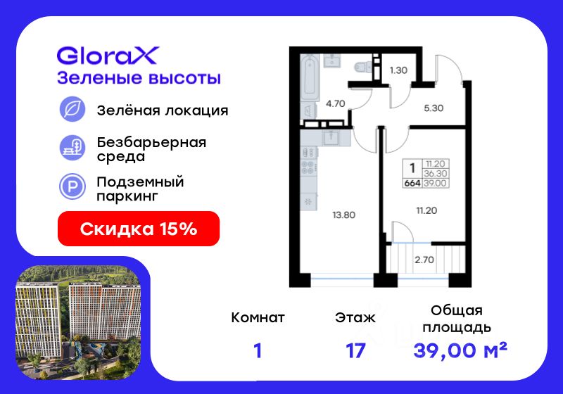 Продается 1-комн. квартира на 17-м этаже в жилом квартале GloraX Зелёные высоты — проекте в тихой зелёной локации. Общая площадь квартиры 39,00 кв. м, из которых 11,20 кв. м включая 11,20 кв. м жилого пространства и 13,80 кв. м кухни. Номер квартиры - 664. Преимущества квартиры: компактная евро-2, лоджия, гардеробная. Преимущества проекта: • Идеальное сочетание городской и загородной жизни • Сдаем в 2025 году • Уютный зелёный район с развитой инфраструктурой • Великолепные виды на Вечнозеленый сквер и лесопарк на 150 Га • Видеонаблюдение, IP-домофон, Wi-Fi на территории, • Дизайнерские входные группы • Безбарьерная среда, колясочные, туалеты на 1 этаже, лапомойки • Эксклюзивное благоустройство территории • Подземный паркинг на 235 машино-мест с лифтом на жилые этажи • Индивидуальные кладовые от 3 до 7 кв. м • Черновая отделка для реализации любых дизайнерских идей GloraX Зелёные высоты — современный жилой проект, сочетающий преимущества городской и пригородной жизни. Комплекс тщательно продуман для максимального удобства и обеспечения безопасности жителей. Квартал расположен в зеленом, живописном и активно развивающемся районе Зеленый Угол, вдали от серой массовой застройки. Жители GloraX Зелёные высоты смогут насладждаться прогулками в Вечнозелёном сквере или лесопарке. В непосредственной близости находятся остановки общественного транспорта и автомобильный подъезд со стороны Нейбута. Скоро также появится выездом на трассу Де-Фриз-Седанка, что обеспечит быстрый доступ в любую часть города и пригород. Проект включает 2 корпуса, каждый из которых спроектирован с акцентом на комфорт, безопасность и современный образ жизни. В комплексе предусмотрен подземный паркинг на 235 машиномест с доступом прямо с жилых этажей. Паркинг оборудован современными системами видеонаблюдения, контроля въезда-выезда и пожаротушения. Цокольный этаж здания отведен под индивидуальные кладовые площадью от 3 до 7 квадратных метров, которые можно использовать для хранения сезонных вещей. Доступ к кладовым - на лифте с жилых этажей. Территория жилого квартала благоустроена и включает игровые зоны и спортивные площадки для детей различных возрастных групп, уютные зоны отдыха со скамейками и универсальную воркаут-площадку для активного досуга. В шаговой доступности располагаются все необходимые объекты социальной инфраструктуры. Узнайте больше в отделе продаж — выберите свою квартиру в GloraX Зелёные высоты уже сегодня!