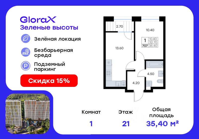 Продается 1-комн. квартира на 21-м этаже в жилом квартале GloraX Зелёные высоты — проекте в тихой зелёной локации. Общая площадь квартиры 35,40 кв. м, из которых 10,40 кв. м включая 10,40 кв. м жилого пространства и 13,60 кв. м кухни. Номер квартиры - 707. Преимущества квартиры: компактная евро-2, лоджия. Преимущества проекта: • Идеальное сочетание городской и загородной жизни • Сдаем в 2025 году • Уютный зелёный район с развитой инфраструктурой • Великолепные виды на Вечнозеленый сквер и лесопарк на 150 Га • Видеонаблюдение, IP-домофон, Wi-Fi на территории, • Дизайнерские входные группы • Безбарьерная среда, колясочные, туалеты на 1 этаже, лапомойки • Эксклюзивное благоустройство территории • Подземный паркинг на 235 машино-мест с лифтом на жилые этажи • Индивидуальные кладовые от 3 до 7 кв. м • Черновая отделка для реализации любых дизайнерских идей GloraX Зелёные высоты — современный жилой проект, сочетающий преимущества городской и пригородной жизни. Комплекс тщательно продуман для максимального удобства и обеспечения безопасности жителей. Квартал расположен в зеленом, живописном и активно развивающемся районе Зеленый Угол, вдали от серой массовой застройки. Жители GloraX Зелёные высоты смогут насладждаться прогулками в Вечнозелёном сквере или лесопарке. В непосредственной близости находятся остановки общественного транспорта и автомобильный подъезд со стороны Нейбута. Скоро также появится выездом на трассу Де-Фриз-Седанка, что обеспечит быстрый доступ в любую часть города и пригород. Проект включает 2 корпуса, каждый из которых спроектирован с акцентом на комфорт, безопасность и современный образ жизни. В комплексе предусмотрен подземный паркинг на 235 машиномест с доступом прямо с жилых этажей. Паркинг оборудован современными системами видеонаблюдения, контроля въезда-выезда и пожаротушения. Цокольный этаж здания отведен под индивидуальные кладовые площадью от 3 до 7 квадратных метров, которые можно использовать для хранения сезонных вещей. Доступ к кладовым - на лифте с жилых этажей. Территория жилого квартала благоустроена и включает игровые зоны и спортивные площадки для детей различных возрастных групп, уютные зоны отдыха со скамейками и универсальную воркаут-площадку для активного досуга. В шаговой доступности располагаются все необходимые объекты социальной инфраструктуры. Узнайте больше в отделе продаж — выберите свою квартиру в GloraX Зелёные высоты уже сегодня!