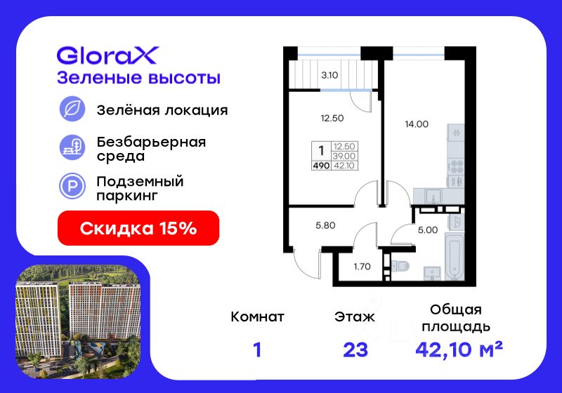 Продается 1-комн. квартира на 23-м этаже в жилом квартале GloraX Зелёные высоты — проекте в тихой зелёной локации. Общая площадь квартиры 42,10 кв. м, из которых 12,50 кв. м включая 12,50 кв. м жилого пространства и 14,00 кв. м кухни. Номер квартиры - 490. Преимущества квартиры: просторная евро-2, лоджия, гардеробная. Преимущества проекта: • Идеальное сочетание городской и загородной жизни • Сдаем в 2025 году • Уютный зелёный район с развитой инфраструктурой • Великолепные виды на Вечнозеленый сквер и лесопарк на 150 Га • Видеонаблюдение, IP-домофон, Wi-Fi на территории, • Дизайнерские входные группы • Безбарьерная среда, колясочные, туалеты на 1 этаже, лапомойки • Эксклюзивное благоустройство территории • Подземный паркинг на 235 машино-мест с лифтом на жилые этажи • Индивидуальные кладовые от 3 до 7 кв. м • Черновая отделка для реализации любых дизайнерских идей GloraX Зелёные высоты — современный жилой проект, сочетающий преимущества городской и пригородной жизни. Комплекс тщательно продуман для максимального удобства и обеспечения безопасности жителей. Квартал расположен в зеленом, живописном и активно развивающемся районе Зеленый Угол, вдали от серой массовой застройки. Жители GloraX Зелёные высоты смогут насладждаться прогулками в Вечнозелёном сквере или лесопарке. В непосредственной близости находятся остановки общественного транспорта и автомобильный подъезд со стороны Нейбута. Скоро также появится выездом на трассу Де-Фриз-Седанка, что обеспечит быстрый доступ в любую часть города и пригород. Проект включает 2 корпуса, каждый из которых спроектирован с акцентом на комфорт, безопасность и современный образ жизни. В комплексе предусмотрен подземный паркинг на 235 машиномест с доступом прямо с жилых этажей. Паркинг оборудован современными системами видеонаблюдения, контроля въезда-выезда и пожаротушения. Цокольный этаж здания отведен под индивидуальные кладовые площадью от 3 до 7 квадратных метров, которые можно использовать для хранения сезонных вещей. Доступ к кладовым - на лифте с жилых этажей. Территория жилого квартала благоустроена и включает игровые зоны и спортивные площадки для детей различных возрастных групп, уютные зоны отдыха со скамейками и универсальную воркаут-площадку для активного досуга. В шаговой доступности располагаются все необходимые объекты социальной инфраструктуры. Узнайте больше в отделе продаж — выберите свою квартиру в GloraX Зелёные высоты уже сегодня!