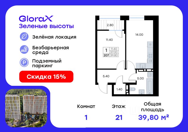 Продается 1-комн. квартира на 21-м этаже в жилом квартале GloraX Зелёные высоты — проекте в тихой зелёной локации. Общая площадь квартиры 39,80 кв. м, из которых 11,40 кв. м включая 11,40 кв. м жилого пространства и 14,00 кв. м кухни. Номер квартиры - 207. Преимущества квартиры: компактная евро-2, лоджия, гардеробная. Преимущества проекта: • Идеальное сочетание городской и загородной жизни • Сдаем в 2025 году • Уютный зелёный район с развитой инфраструктурой • Великолепные виды на Вечнозеленый сквер и лесопарк на 150 Га • Видеонаблюдение, IP-домофон, Wi-Fi на территории, • Дизайнерские входные группы • Безбарьерная среда, колясочные, туалеты на 1 этаже, лапомойки • Эксклюзивное благоустройство территории • Подземный паркинг на 235 машино-мест с лифтом на жилые этажи • Индивидуальные кладовые от 3 до 7 кв. м • Черновая отделка для реализации любых дизайнерских идей GloraX Зелёные высоты — современный жилой проект, сочетающий преимущества городской и пригородной жизни. Комплекс тщательно продуман для максимального удобства и обеспечения безопасности жителей. Квартал расположен в зеленом, живописном и активно развивающемся районе Зеленый Угол, вдали от серой массовой застройки. Жители GloraX Зелёные высоты смогут насладждаться прогулками в Вечнозелёном сквере или лесопарке. В непосредственной близости находятся остановки общественного транспорта и автомобильный подъезд со стороны Нейбута. Скоро также появится выездом на трассу Де-Фриз-Седанка, что обеспечит быстрый доступ в любую часть города и пригород. Проект включает 2 корпуса, каждый из которых спроектирован с акцентом на комфорт, безопасность и современный образ жизни. В комплексе предусмотрен подземный паркинг на 235 машиномест с доступом прямо с жилых этажей. Паркинг оборудован современными системами видеонаблюдения, контроля въезда-выезда и пожаротушения. Цокольный этаж здания отведен под индивидуальные кладовые площадью от 3 до 7 квадратных метров, которые можно использовать для хранения сезонных вещей. Доступ к кладовым - на лифте с жилых этажей. Территория жилого квартала благоустроена и включает игровые зоны и спортивные площадки для детей различных возрастных групп, уютные зоны отдыха со скамейками и универсальную воркаут-площадку для активного досуга. В шаговой доступности располагаются все необходимые объекты социальной инфраструктуры. Узнайте больше в отделе продаж — выберите свою квартиру в GloraX Зелёные высоты уже сегодня!