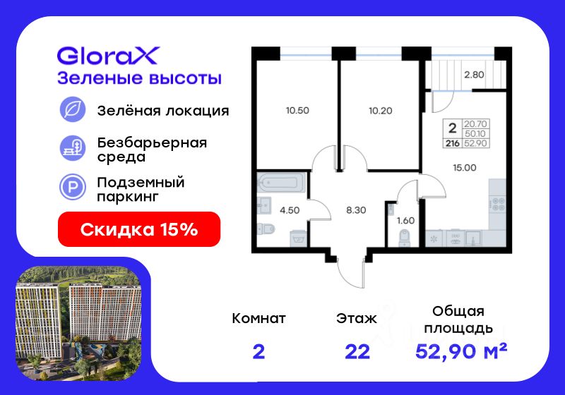 Продается 2-комн. квартира на 22-м этаже в жилом квартале GloraX Зелёные высоты — проекте в тихой зелёной локации. Общая площадь квартиры 52,90 кв. м, из которых 20,70 кв. м включая 20,70 кв. м жилого пространства и 15,00 кв. м кухни. Номер квартиры - 216. Преимущества квартиры: компактная евро-3, лоджия. Преимущества проекта: • Идеальное сочетание городской и загородной жизни • Сдаем в 2025 году • Уютный зелёный район с развитой инфраструктурой • Великолепные виды на Вечнозеленый сквер и лесопарк на 150 Га • Видеонаблюдение, IP-домофон, Wi-Fi на территории, • Дизайнерские входные группы • Безбарьерная среда, колясочные, туалеты на 1 этаже, лапомойки • Эксклюзивное благоустройство территории • Подземный паркинг на 235 машино-мест с лифтом на жилые этажи • Индивидуальные кладовые от 3 до 7 кв. м • Черновая отделка для реализации любых дизайнерских идей GloraX Зелёные высоты — современный жилой проект, сочетающий преимущества городской и пригородной жизни. Комплекс тщательно продуман для максимального удобства и обеспечения безопасности жителей. Квартал расположен в зеленом, живописном и активно развивающемся районе Зеленый Угол, вдали от серой массовой застройки. Жители GloraX Зелёные высоты смогут насладждаться прогулками в Вечнозелёном сквере или лесопарке. В непосредственной близости находятся остановки общественного транспорта и автомобильный подъезд со стороны Нейбута. Скоро также появится выездом на трассу Де-Фриз-Седанка, что обеспечит быстрый доступ в любую часть города и пригород. Проект включает 2 корпуса, каждый из которых спроектирован с акцентом на комфорт, безопасность и современный образ жизни. В комплексе предусмотрен подземный паркинг на 235 машиномест с доступом прямо с жилых этажей. Паркинг оборудован современными системами видеонаблюдения, контроля въезда-выезда и пожаротушения. Цокольный этаж здания отведен под индивидуальные кладовые площадью от 3 до 7 квадратных метров, которые можно использовать для хранения сезонных вещей. Доступ к кладовым - на лифте с жилых этажей. Территория жилого квартала благоустроена и включает игровые зоны и спортивные площадки для детей различных возрастных групп, уютные зоны отдыха со скамейками и универсальную воркаут-площадку для активного досуга. В шаговой доступности располагаются все необходимые объекты социальной инфраструктуры. Узнайте больше в отделе продаж — выберите свою квартиру в GloraX Зелёные высоты уже сегодня!