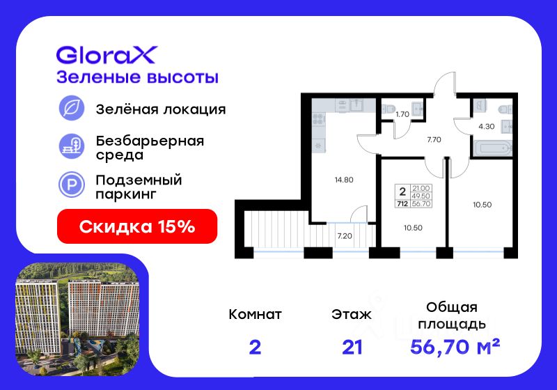 Продается 2-комн. квартира на 21-м этаже в жилом квартале GloraX Зелёные высоты — проекте в тихой зелёной локации. Общая площадь квартиры 56,70 кв. м, из которых 21,00 кв. м включая 21,00 кв. м жилого пространства и 14,80 кв. м кухни. Номер квартиры - 712. Преимущества квартиры: компактная евро-3, лоджия. Преимущества проекта: • Идеальное сочетание городской и загородной жизни • Сдаем в 2025 году • Уютный зелёный район с развитой инфраструктурой • Великолепные виды на Вечнозеленый сквер и лесопарк на 150 Га • Видеонаблюдение, IP-домофон, Wi-Fi на территории, • Дизайнерские входные группы • Безбарьерная среда, колясочные, туалеты на 1 этаже, лапомойки • Эксклюзивное благоустройство территории • Подземный паркинг на 235 машино-мест с лифтом на жилые этажи • Индивидуальные кладовые от 3 до 7 кв. м • Черновая отделка для реализации любых дизайнерских идей GloraX Зелёные высоты — современный жилой проект, сочетающий преимущества городской и пригородной жизни. Комплекс тщательно продуман для максимального удобства и обеспечения безопасности жителей. Квартал расположен в зеленом, живописном и активно развивающемся районе Зеленый Угол, вдали от серой массовой застройки. Жители GloraX Зелёные высоты смогут насладждаться прогулками в Вечнозелёном сквере или лесопарке. В непосредственной близости находятся остановки общественного транспорта и автомобильный подъезд со стороны Нейбута. Скоро также появится выездом на трассу Де-Фриз-Седанка, что обеспечит быстрый доступ в любую часть города и пригород. Проект включает 2 корпуса, каждый из которых спроектирован с акцентом на комфорт, безопасность и современный образ жизни. В комплексе предусмотрен подземный паркинг на 235 машиномест с доступом прямо с жилых этажей. Паркинг оборудован современными системами видеонаблюдения, контроля въезда-выезда и пожаротушения. Цокольный этаж здания отведен под индивидуальные кладовые площадью от 3 до 7 квадратных метров, которые можно использовать для хранения сезонных вещей. Доступ к кладовым - на лифте с жилых этажей. Территория жилого квартала благоустроена и включает игровые зоны и спортивные площадки для детей различных возрастных групп, уютные зоны отдыха со скамейками и универсальную воркаут-площадку для активного досуга. В шаговой доступности располагаются все необходимые объекты социальной инфраструктуры. Узнайте больше в отделе продаж — выберите свою квартиру в GloraX Зелёные высоты уже сегодня!