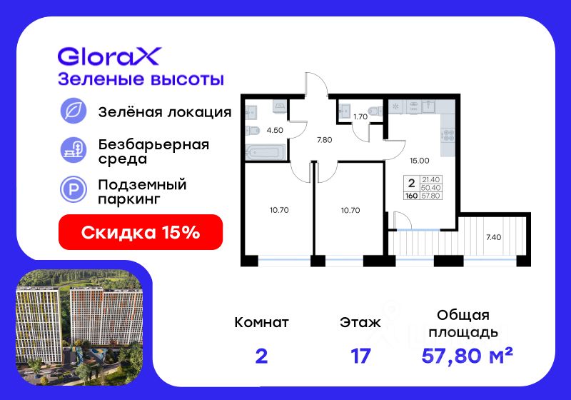Продается 2-комн. квартира на 17-м этаже в жилом квартале GloraX Зелёные высоты — проекте в тихой зелёной локации. Общая площадь квартиры 57,80 кв. м, из которых 21,40 кв. м включая 21,40 кв. м жилого пространства и 15,00 кв. м кухни. Номер квартиры - 160. Преимущества квартиры: компактная евро-3, вид на лесопарк, лоджия. Преимущества проекта: • Идеальное сочетание городской и загородной жизни • Сдаем в 2025 году • Уютный зелёный район с развитой инфраструктурой • Великолепные виды на Вечнозеленый сквер и лесопарк на 150 Га • Видеонаблюдение, IP-домофон, Wi-Fi на территории, • Дизайнерские входные группы • Безбарьерная среда, колясочные, туалеты на 1 этаже, лапомойки • Эксклюзивное благоустройство территории • Подземный паркинг на 235 машино-мест с лифтом на жилые этажи • Индивидуальные кладовые от 3 до 7 кв. м • Черновая отделка для реализации любых дизайнерских идей GloraX Зелёные высоты — современный жилой проект, сочетающий преимущества городской и пригородной жизни. Комплекс тщательно продуман для максимального удобства и обеспечения безопасности жителей. Квартал расположен в зеленом, живописном и активно развивающемся районе Зеленый Угол, вдали от серой массовой застройки. Жители GloraX Зелёные высоты смогут насладждаться прогулками в Вечнозелёном сквере или лесопарке. В непосредственной близости находятся остановки общественного транспорта и автомобильный подъезд со стороны Нейбута. Скоро также появится выездом на трассу Де-Фриз-Седанка, что обеспечит быстрый доступ в любую часть города и пригород. Проект включает 2 корпуса, каждый из которых спроектирован с акцентом на комфорт, безопасность и современный образ жизни. В комплексе предусмотрен подземный паркинг на 235 машиномест с доступом прямо с жилых этажей. Паркинг оборудован современными системами видеонаблюдения, контроля въезда-выезда и пожаротушения. Цокольный этаж здания отведен под индивидуальные кладовые площадью от 3 до 7 квадратных метров, которые можно использовать для хранения сезонных вещей. Доступ к кладовым - на лифте с жилых этажей. Территория жилого квартала благоустроена и включает игровые зоны и спортивные площадки для детей различных возрастных групп, уютные зоны отдыха со скамейками и универсальную воркаут-площадку для активного досуга. В шаговой доступности располагаются все необходимые объекты социальной инфраструктуры. Узнайте больше в отделе продаж — выберите свою квартиру в GloraX Зелёные высоты уже сегодня!