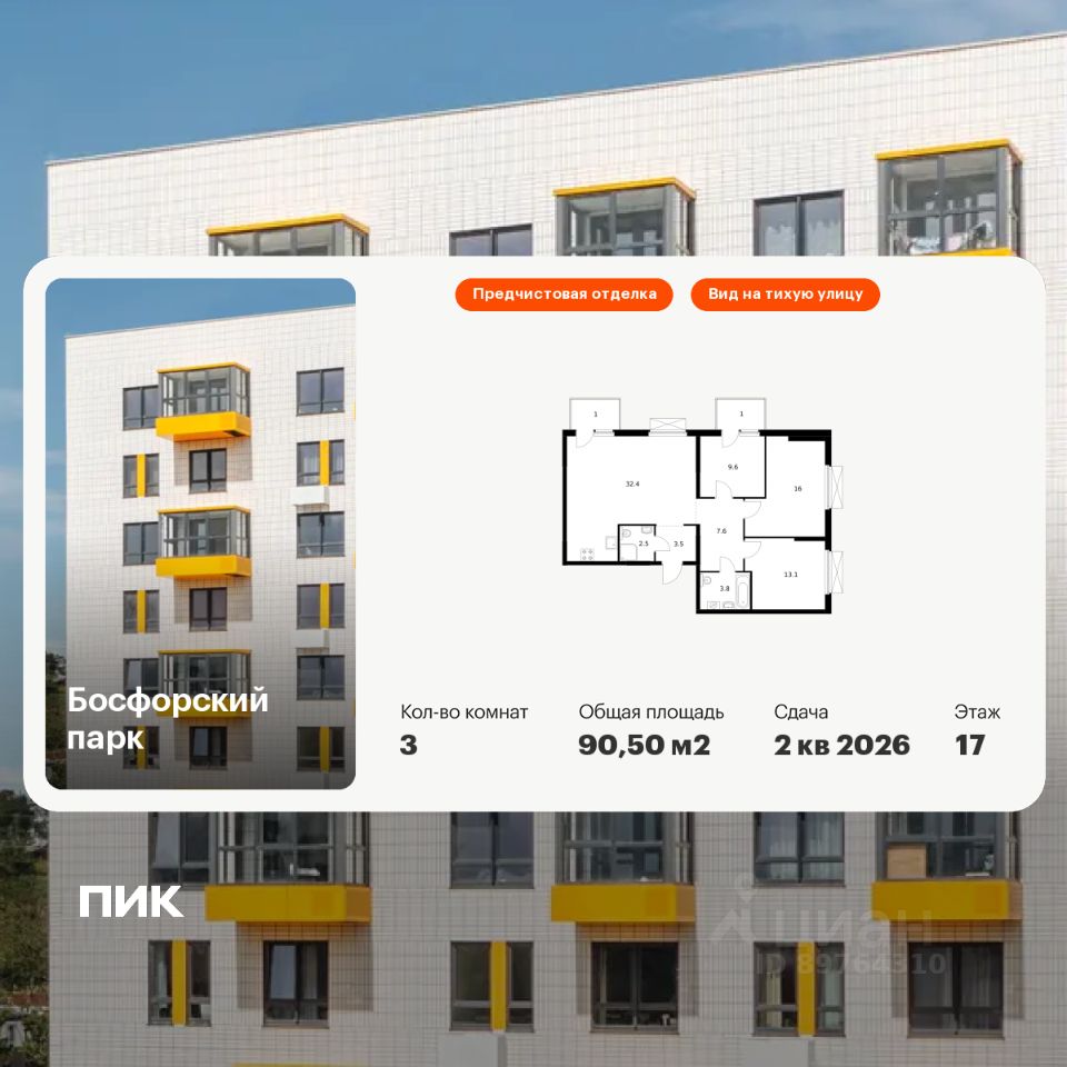 Продаётся 3-комн. квартира площадью 90,5 кв.м на 17 этаже 17 этажного дома (Корпус 5, Секция 1) проекта ПИК Босфорский парк. Светлый просторный подъезд на уровне земли, функциональная планировка, большие окна, предчистовая отделка. Жилой квартал ''Босфорский парк'' расположен на юге Владивостока, в районе живописной бухты Патрокл. Из окон домов будет открываться прекрасный вид на залив и лес. Дорога до центра Владивостока на автомобиле займёт 20 минут. В ''Босфорском парке'' появится 20 жилых корпусов с магазинами, кафе и полезными сервисами на первых этажах. На территории проекта предусмотрены два многоуровневых надземных паркинга. В квартале будет много мест для отдыха и активных игр, три вида парков и даже родник, который будет перетекать в ручей с порогами и препятствиями. На территории парков появятся амфитеатры и террасы. Здесь жители смогут отдыхать, гулять, общаться, учиться или работать на свежем воздухе. На естественных склонах будут обустроены игровые зоны для детей - с горками, сетками, канатами и скалолазными зацепами. Всё это - новый формат благоустройства ''Многоуровневый ландшафт'', который разработан специально для регионов с перепадами высот. Ещё на этапе проектирования архитекторы учли все особенности рельефа, чтобы создать органичное пространство. Артикул 937606 (Застройщик ООО ''СПЕЦИАЛИЗИРОВАННЫЙ ЗАСТРОЙЩИК ПИК-ПРИМОРЬЕ'')