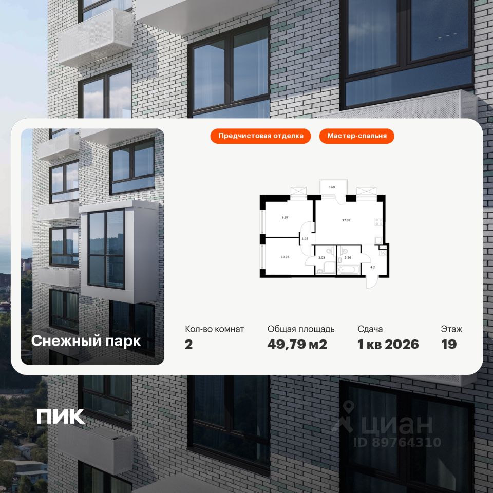 Продаётся 2-комн. квартира площадью 49,79 кв.м на 19 этаже 24 этажного дома (Корпус 2, Секция 2) проекта ПИК Снежный парк. Светлый просторный подъезд на уровне земли, функциональная планировка, большие окна, предчистовая отделка. Жилой квартал ''Снежный парк'' возводится в развитом микрорайоне Владивостока - Снеговой Пади. Рядом уже есть всё для комфортной жизни: 2 школы, детская и взрослая поликлиники, торговый центр и магазины. Проект будет состоять из 7 корпусов, высота которых от 24 до 29 этажей. Благодаря низкой плотности застройки жители будут чувствовать себя комфортно. За счёт переменной этажности в квартиры будет попадать ещё больше естественного света. Из окон последних этажей будет открываться панорамный вид на Амурский залив и лес. В квартирах предусмотрены большие окна, застеклённые балконы и лоджии - будет светло и уютно даже зимой. В жилом квартале появится уникальное общественное пространство с пешеходным бульваром и зонами для отдыха. На первых этажах откроются кафе, магазины и полезные сервисы, куда можно спуститься за горячим кофе или свежеиспечённым хлебом. Из каждого дома будет выход в уютный двор-парк с современными детскими и спортивными площадками. Здесь мы посадим цветы и деревья: будет приятно отдыхать или почитать книгу. Артикул 785615 (Застройщик ООО ''СЗ ФОРМУЛА-ДВ'')