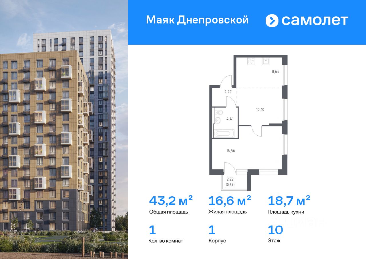 Строим кварталы для жизни с заботой о будущем. Предлагается 1-комнатная квартира комфорт-класса 43,15 кв.м в корпусе 1 на 10 этаже, в ЖК ''Маяк Днепровской'' Квартира с чистовой отделкой. Доступность дополнительных опций уточняйте у застройщика. Приобрести квартиру возможно по специальным акциям от застройщика, с текущими условиями акций можно ознакомиться в блоке ''Акций''. Цена динамическая и может отличаться, уточняйте актуальность у застройщика. ''Маяк Днепровской'' — это маленький город с домами высотой от 17 до 30 этажей. Мы строим современные здания со стилобатами и террасами, которые отвечают архитектурным трендам, но при этом гармонично вписываются в окружающие пейзажи. Переменная этажность домов повторяет уникальный дальневосточный ландшафт, а оттенки фасадов перекликаются с красками природы. Здесь вы будете любоваться живописными закатами и встречать рассветы с панорамного балкона.