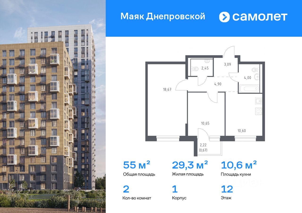 Строим кварталы для жизни с заботой о будущем. Предлагается 2-комнатная квартира комфорт-класса 55,03 кв.м в корпусе 1 на 12 этаже, в ЖК ''Маяк Днепровской'' Квартира с предчистовой отделкой. Доступность дополнительных опций уточняйте у застройщика. Приобрести квартиру возможно по специальным акциям от застройщика, с текущими условиями акций можно ознакомиться в блоке ''Акций''. Цена динамическая и может отличаться, уточняйте актуальность у застройщика. ''Маяк Днепровской'' — это маленький город с домами высотой от 17 до 30 этажей. Мы строим современные здания со стилобатами и террасами, которые отвечают архитектурным трендам, но при этом гармонично вписываются в окружающие пейзажи. Переменная этажность домов повторяет уникальный дальневосточный ландшафт, а оттенки фасадов перекликаются с красками природы. Здесь вы будете любоваться живописными закатами и встречать рассветы с панорамного балкона.