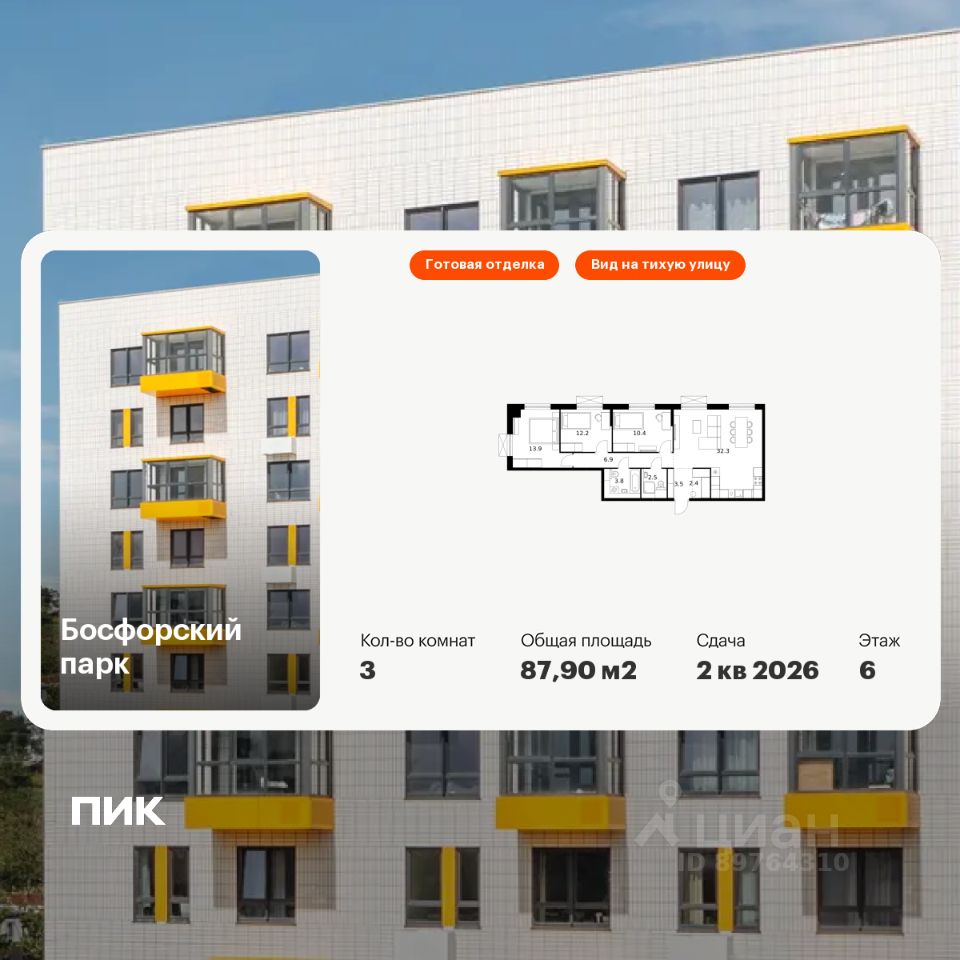 Продаётся 3-комн. квартира площадью 87,9 кв.м на 6 этаже 9 этажного дома (Корпус 6, Секция 1) проекта ПИК Босфорский парк. Светлый просторный подъезд на уровне земли, функциональная планировка, большие окна, c отделкой. Жилой квартал ''Босфорский парк'' расположен на юге Владивостока, в районе живописной бухты Патрокл. Из окон домов будет открываться прекрасный вид на залив и лес. Дорога до центра Владивостока на автомобиле займёт 20 минут. В ''Босфорском парке'' появится 20 жилых корпусов с магазинами, кафе и полезными сервисами на первых этажах. На территории проекта предусмотрены два многоуровневых надземных паркинга. В квартале будет много мест для отдыха и активных игр, три вида парков и даже родник, который будет перетекать в ручей с порогами и препятствиями. На территории парков появятся амфитеатры и террасы. Здесь жители смогут отдыхать, гулять, общаться, учиться или работать на свежем воздухе. На естественных склонах будут обустроены игровые зоны для детей - с горками, сетками, канатами и скалолазными зацепами. Всё это - новый формат благоустройства ''Многоуровневый ландшафт'', который разработан специально для регионов с перепадами высот. Ещё на этапе проектирования архитекторы учли все особенности рельефа, чтобы создать органичное пространство. Артикул 959896 (Застройщик ООО ''СПЕЦИАЛИЗИРОВАННЫЙ ЗАСТРОЙЩИК ПИК-ПРИМОРЬЕ'')