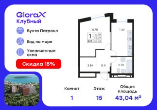 Продается 1-комн. квартира на 15-м этаже в квартале GloraX Клубный. GloraX Клубный - уникальный видовой проект с выделяющейся архитектурой в развитом районе Владивостока. Общая площадь лота составляет 43,04 кв. м, из которых 16,78 кв. м отведено под жилую и 11,61 кв. м под кухонную зону. Номер квартиры - 376.Преимущества квартиры:однокомнатная квартира, высокий этаж, гардеробная.Преимущества проекта:• Квартиры с панорамными видами на бухту Патрокл, маяк Басаргина и остров Русский• Планировочные решения под любой жизненный сценарий от 23 до 67 м²• Гардеробные комнаты, увеличенные панорамные окна, просторные кухни-гостиные• Эксклюзивное благоустройство: продуманное зонирование, игровые и спортивные площадки, площадка для стритбола, амфитеатр• Премиальный дизайн входных групп с лаунж-зоной• Безбарьерная среда, закрытая территория, видеонаблюдение• Лапомойки, колясочные и туалеты на первом этаже• Двухуровневый подземный паркинг на 350 машино-мест с лифтом на жилые этажи• Келлеры на цокольном этаже для хранения сезонных вещей с доступом на лифте• Современный ландшафтный дизайн комплекса от DEREVOPARKGloraX Клубный заповедник в черте мегаполиса. Комплекс тщательно продуман для максимального удобства и обеспечения безопасности его жителей. Квартал расположен в одном из самых современных развивающихся районов города: совсем рядом раскинулась живописная бухта Патрокл, где можно прогуляться по облагороженной пешеходной набережной, заглянуть на пляж или в школу серфинга. Комплекс имеет прекрасную транспортную доступность: рядом проходит объездная трасса СеданкаПатрокл, а до центар можно доехать всего за 15 минут.Проект включает 3 монолитных корпуса, каждый из которых спроектирован с акцентом на комфорт, безопасность и современный образ жизни рядом с уникальной природой. Общий двор создает приватную территорию для житей комплекса.В комплексе предусмотрен двухуровневый подземный паркинг на 350 машино-мест с доступом прямо с жилых этажей. Паркинг оборудован современными системами видеонаблюдения, контроля въезда-выезда и пожаротушения. На цокольном этаже размещаются келлеры для хранения сезонных и габаритных вещей. Доступ к кладовым на лифте с жилых этажей. Современный ландшафтный дизайн жилого комплекса GloraX Клубный создан ведущей российской студией DEREVOPARK. Во дворе для детей всех возрастов предусмотрены различные игровые площадки с лазалками, батутами, качелями и песочницей. В центре расположен специальный ''зеленый остров'', где взрослые могут отдохнуть на качелях и гамаках в тени больших деревьев. Для любителей спорта предусмотрены две специальные спортивные площадки для настольного тенниса и стритбола — для зрителей тоже найдется место! А еще на территории комплекса будет дорожка для роллеров и любителей покататься на велосипеде, самокате или скейте.В шаговой доступности располагаются все необходимые объекты социальной и коммерческой инфраструктуры.Цена у