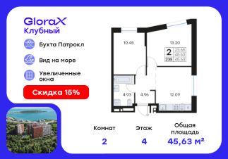 Продается 2-комн. квартира на 4-м этаже в квартале GloraX Клубный. GloraX Клубный - уникальный видовой проект с выделяющейся архитектурой в развитом районе Владивостока. Общая площадь лота составляет 45,63 кв. м, из которых 23,65 кв. м отведено под жилую и 12,09 кв. м под кухонную зону. Номер квартиры - 235.Преимущества квартиры:двухкомнатная квартира, угловая.Преимущества проекта:• Квартиры с панорамными видами на бухту Патрокл, маяк Басаргина и остров Русский• Планировочные решения под любой жизненный сценарий от 23 до 67 м²• Гардеробные комнаты, увеличенные панорамные окна, просторные кухни-гостиные• Эксклюзивное благоустройство: продуманное зонирование, игровые и спортивные площадки, площадка для стритбола, амфитеатр• Премиальный дизайн входных групп с лаунж-зоной• Безбарьерная среда, закрытая территория, видеонаблюдение• Лапомойки, колясочные и туалеты на первом этаже• Двухуровневый подземный паркинг на 350 машино-мест с лифтом на жилые этажи• Келлеры на цокольном этаже для хранения сезонных вещей с доступом на лифте• Современный ландшафтный дизайн комплекса от DEREVOPARKGloraX Клубный заповедник в черте мегаполиса. Комплекс тщательно продуман для максимального удобства и обеспечения безопасности его жителей. Квартал расположен в одном из самых современных развивающихся районов города: совсем рядом раскинулась живописная бухта Патрокл, где можно прогуляться по облагороженной пешеходной набережной, заглянуть на пляж или в школу серфинга. Комплекс имеет прекрасную транспортную доступность: рядом проходит объездная трасса СеданкаПатрокл, а до центар можно доехать всего за 15 минут.Проект включает 3 монолитных корпуса, каждый из которых спроектирован с акцентом на комфорт, безопасность и современный образ жизни рядом с уникальной природой. Общий двор создает приватную территорию для житей комплекса.В комплексе предусмотрен двухуровневый подземный паркинг на 350 машино-мест с доступом прямо с жилых этажей. Паркинг оборудован современными системами видеонаблюдения, контроля въезда-выезда и пожаротушения. На цокольном этаже размещаются келлеры для хранения сезонных и габаритных вещей. Доступ к кладовым на лифте с жилых этажей. Современный ландшафтный дизайн жилого комплекса GloraX Клубный создан ведущей российской студией DEREVOPARK. Во дворе для детей всех возрастов предусмотрены различные игровые площадки с лазалками, батутами, качелями и песочницей. В центре расположен специальный ''зеленый остров'', где взрослые могут отдохнуть на качелях и гамаках в тени больших деревьев. Для любителей спорта предусмотрены две специальные спортивные площадки для настольного тенниса и стритбола — для зрителей тоже найдется место! А еще на территории комплекса будет дорожка для роллеров и любителей покататься на велосипеде, самокате или скейте.В шаговой доступности располагаются все необходимые объекты социальной и коммерческой инфраструктуры.Цена указана при 100% опл