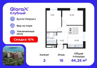 Продается 2-комн. квартира на 15-м этаже в квартале GloraX Клубный. GloraX Клубный - уникальный видовой проект с выделяющейся архитектурой в развитом районе Владивостока. Общая площадь лота составляет 44,25 кв. м, из которых 22,15 кв. м отведено под жилую и 13,43 кв. м под кухонную зону. Номер квартиры - 391.Преимущества квартиры:евро-трехкомнатная квартира, высокий этаж, угловая.Преимущества проекта:• Квартиры с панорамными видами на бухту Патрокл, маяк Басаргина и остров Русский• Планировочные решения под любой жизненный сценарий от 23 до 67 м²• Гардеробные комнаты, увеличенные панорамные окна, просторные кухни-гостиные• Эксклюзивное благоустройство: продуманное зонирование, игровые и спортивные площадки, площадка для стритбола, амфитеатр• Премиальный дизайн входных групп с лаунж-зоной• Безбарьерная среда, закрытая территория, видеонаблюдение• Лапомойки, колясочные и туалеты на первом этаже• Двухуровневый подземный паркинг на 350 машино-мест с лифтом на жилые этажи• Келлеры на цокольном этаже для хранения сезонных вещей с доступом на лифте• Современный ландшафтный дизайн комплекса от DEREVOPARKGloraX Клубный заповедник в черте мегаполиса. Комплекс тщательно продуман для максимального удобства и обеспечения безопасности его жителей. Квартал расположен в одном из самых современных развивающихся районов города: совсем рядом раскинулась живописная бухта Патрокл, где можно прогуляться по облагороженной пешеходной набережной, заглянуть на пляж или в школу серфинга. Комплекс имеет прекрасную транспортную доступность: рядом проходит объездная трасса СеданкаПатрокл, а до центар можно доехать всего за 15 минут.Проект включает 3 монолитных корпуса, каждый из которых спроектирован с акцентом на комфорт, безопасность и современный образ жизни рядом с уникальной природой. Общий двор создает приватную территорию для житей комплекса.В комплексе предусмотрен двухуровневый подземный паркинг на 350 машино-мест с доступом прямо с жилых этажей. Паркинг оборудован современными системами видеонаблюдения, контроля въезда-выезда и пожаротушения. На цокольном этаже размещаются келлеры для хранения сезонных и габаритных вещей. Доступ к кладовым на лифте с жилых этажей. Современный ландшафтный дизайн жилого комплекса GloraX Клубный создан ведущей российской студией DEREVOPARK. Во дворе для детей всех возрастов предусмотрены различные игровые площадки с лазалками, батутами, качелями и песочницей. В центре расположен специальный ''зеленый остров'', где взрослые могут отдохнуть на качелях и гамаках в тени больших деревьев. Для любителей спорта предусмотрены две специальные спортивные площадки для настольного тенниса и стритбола — для зрителей тоже найдется место! А еще на территории комплекса будет дорожка для роллеров и любителей покататься на велосипеде, самокате или скейте.В шаговой доступности располагаются все необходимые объекты социальной и коммерческой инфраструктуры.Цена