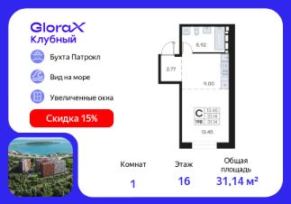 Продается квартира-студия на 16-м этаже в квартале GloraX Клубный. GloraX Клубный - уникальный видовой проект с выделяющейся архитектурой в развитом районе Владивостока. Общая площадь лота составляет 31,14 кв. м, из которых 13,45 кв. м отведено под жилую и 9,00 кв. м под кухонную зону. Номер квартиры - 198.Преимущества квартиры:студия, высокий этаж.Преимущества проекта:• Квартиры с панорамными видами на бухту Патрокл, маяк Басаргина и остров Русский• Планировочные решения под любой жизненный сценарий от 23 до 67 м²• Гардеробные комнаты, увеличенные панорамные окна, просторные кухни-гостиные• Эксклюзивное благоустройство: продуманное зонирование, игровые и спортивные площадки, площадка для стритбола, амфитеатр• Премиальный дизайн входных групп с лаунж-зоной• Безбарьерная среда, закрытая территория, видеонаблюдение• Лапомойки, колясочные и туалеты на первом этаже• Двухуровневый подземный паркинг на 350 машино-мест с лифтом на жилые этажи• Келлеры на цокольном этаже для хранения сезонных вещей с доступом на лифте• Современный ландшафтный дизайн комплекса от DEREVOPARKGloraX Клубный заповедник в черте мегаполиса. Комплекс тщательно продуман для максимального удобства и обеспечения безопасности его жителей. Квартал расположен в одном из самых современных развивающихся районов города: совсем рядом раскинулась живописная бухта Патрокл, где можно прогуляться по облагороженной пешеходной набережной, заглянуть на пляж или в школу серфинга. Комплекс имеет прекрасную транспортную доступность: рядом проходит объездная трасса СеданкаПатрокл, а до центар можно доехать всего за 15 минут.Проект включает 3 монолитных корпуса, каждый из которых спроектирован с акцентом на комфорт, безопасность и современный образ жизни рядом с уникальной природой. Общий двор создает приватную территорию для житей комплекса.В комплексе предусмотрен двухуровневый подземный паркинг на 350 машино-мест с доступом прямо с жилых этажей. Паркинг оборудован современными системами видеонаблюдения, контроля въезда-выезда и пожаротушения. На цокольном этаже размещаются келлеры для хранения сезонных и габаритных вещей. Доступ к кладовым на лифте с жилых этажей. Современный ландшафтный дизайн жилого комплекса GloraX Клубный создан ведущей российской студией DEREVOPARK. Во дворе для детей всех возрастов предусмотрены различные игровые площадки с лазалками, батутами, качелями и песочницей. В центре расположен специальный ''зеленый остров'', где взрослые могут отдохнуть на качелях и гамаках в тени больших деревьев. Для любителей спорта предусмотрены две специальные спортивные площадки для настольного тенниса и стритбола — для зрителей тоже найдется место! А еще на территории комплекса будет дорожка для роллеров и любителей покататься на велосипеде, самокате или скейте.В шаговой доступности располагаются все необходимые объекты социальной и коммерческой инфраструктуры.Цена указана при 100% оплате или станд