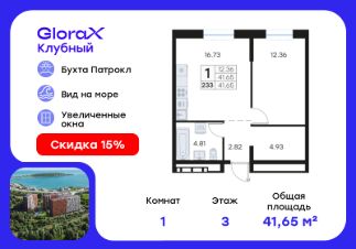 Продается 1-комн. квартира на 3-м этаже в квартале GloraX Клубный. GloraX Клубный - уникальный видовой проект с выделяющейся архитектурой в развитом районе Владивостока. Общая площадь лота составляет 41,65 кв. м, из которых 12,36 кв. м отведено под жилую и 16,73 кв. м под кухонную зону. Номер квартиры - 233.Преимущества квартиры:евро-двухкомнатная квартира, гардеробная.Преимущества проекта:• Квартиры с панорамными видами на бухту Патрокл, маяк Басаргина и остров Русский• Планировочные решения под любой жизненный сценарий от 23 до 67 м²• Гардеробные комнаты, увеличенные панорамные окна, просторные кухни-гостиные• Эксклюзивное благоустройство: продуманное зонирование, игровые и спортивные площадки, площадка для стритбола, амфитеатр• Премиальный дизайн входных групп с лаунж-зоной• Безбарьерная среда, закрытая территория, видеонаблюдение• Лапомойки, колясочные и туалеты на первом этаже• Двухуровневый подземный паркинг на 350 машино-мест с лифтом на жилые этажи• Келлеры на цокольном этаже для хранения сезонных вещей с доступом на лифте• Современный ландшафтный дизайн комплекса от DEREVOPARKGloraX Клубный заповедник в черте мегаполиса. Комплекс тщательно продуман для максимального удобства и обеспечения безопасности его жителей. Квартал расположен в одном из самых современных развивающихся районов города: совсем рядом раскинулась живописная бухта Патрокл, где можно прогуляться по облагороженной пешеходной набережной, заглянуть на пляж или в школу серфинга. Комплекс имеет прекрасную транспортную доступность: рядом проходит объездная трасса СеданкаПатрокл, а до центар можно доехать всего за 15 минут.Проект включает 3 монолитных корпуса, каждый из которых спроектирован с акцентом на комфорт, безопасность и современный образ жизни рядом с уникальной природой. Общий двор создает приватную территорию для житей комплекса.В комплексе предусмотрен двухуровневый подземный паркинг на 350 машино-мест с доступом прямо с жилых этажей. Паркинг оборудован современными системами видеонаблюдения, контроля въезда-выезда и пожаротушения. На цокольном этаже размещаются келлеры для хранения сезонных и габаритных вещей. Доступ к кладовым на лифте с жилых этажей. Современный ландшафтный дизайн жилого комплекса GloraX Клубный создан ведущей российской студией DEREVOPARK. Во дворе для детей всех возрастов предусмотрены различные игровые площадки с лазалками, батутами, качелями и песочницей. В центре расположен специальный ''зеленый остров'', где взрослые могут отдохнуть на качелях и гамаках в тени больших деревьев. Для любителей спорта предусмотрены две специальные спортивные площадки для настольного тенниса и стритбола — для зрителей тоже найдется место! А еще на территории комплекса будет дорожка для роллеров и любителей покататься на велосипеде, самокате или скейте.В шаговой доступности располагаются все необходимые объекты социальной и коммерческой инфраструктуры.Цена указана при