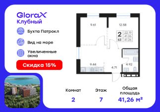 Продается 1-комн. квартира на 3-м этаже в квартале GloraX Клубный. GloraX Клубный - уникальный видовой проект с выделяющейся архитектурой в развитом районе Владивостока. Общая площадь лота составляет 41,70 кв. м, из которых 12,09 кв. м отведено под жилую и 16,15 кв. м под кухонную зону. Номер квартиры - 231.Преимущества квартиры:евро-двухкомнатная квартира, гардеробная.Преимущества проекта:• Квартиры с панорамными видами на бухту Патрокл, маяк Басаргина и остров Русский• Планировочные решения под любой жизненный сценарий от 23 до 67 м²• Гардеробные комнаты, увеличенные панорамные окна, просторные кухни-гостиные• Эксклюзивное благоустройство: продуманное зонирование, игровые и спортивные площадки, площадка для стритбола, амфитеатр• Премиальный дизайн входных групп с лаунж-зоной• Безбарьерная среда, закрытая территория, видеонаблюдение• Лапомойки, колясочные и туалеты на первом этаже• Двухуровневый подземный паркинг на 350 машино-мест с лифтом на жилые этажи• Келлеры на цокольном этаже для хранения сезонных вещей с доступом на лифте• Современный ландшафтный дизайн комплекса от DEREVOPARKGloraX Клубный заповедник в черте мегаполиса. Комплекс тщательно продуман для максимального удобства и обеспечения безопасности его жителей. Квартал расположен в одном из самых современных развивающихся районов города: совсем рядом раскинулась живописная бухта Патрокл, где можно прогуляться по облагороженной пешеходной набережной, заглянуть на пляж или в школу серфинга. Комплекс имеет прекрасную транспортную доступность: рядом проходит объездная трасса СеданкаПатрокл, а до центар можно доехать всего за 15 минут.Проект включает 3 монолитных корпуса, каждый из которых спроектирован с акцентом на комфорт, безопасность и современный образ жизни рядом с уникальной природой. Общий двор создает приватную территорию для житей комплекса.В комплексе предусмотрен двухуровневый подземный паркинг на 350 машино-мест с доступом прямо с жилых этажей. Паркинг оборудован современными системами видеонаблюдения, контроля въезда-выезда и пожаротушения. На цокольном этаже размещаются келлеры для хранения сезонных и габаритных вещей. Доступ к кладовым на лифте с жилых этажей. Современный ландшафтный дизайн жилого комплекса GloraX Клубный создан ведущей российской студией DEREVOPARK. Во дворе для детей всех возрастов предусмотрены различные игровые площадки с лазалками, батутами, качелями и песочницей. В центре расположен специальный ''зеленый остров'', где взрослые могут отдохнуть на качелях и гамаках в тени больших деревьев. Для любителей спорта предусмотрены две специальные спортивные площадки для настольного тенниса и стритбола — для зрителей тоже найдется место! А еще на территории комплекса будет дорожка для роллеров и любителей покататься на велосипеде, самокате или скейте.В шаговой доступности располагаются все необходимые объекты социальной и коммерческой инфраструктуры.Цена указана при