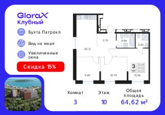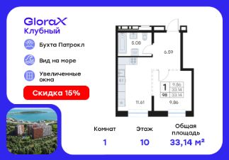 Продается 1-комн. квартира на 5-м этаже в квартале GloraX Клубный. GloraX Клубный - уникальный видовой проект с выделяющейся архитектурой в развитом районе Владивостока. Общая площадь лота составляет 34,90 кв. м, из которых 10,42 кв. м отведено под жилую и 11,95 кв. м под кухонную зону. Номер квартиры - 260.Преимущества квартиры:однокомнатная квартира, гардеробная.Преимущества проекта:• Квартиры с панорамными видами на бухту Патрокл, маяк Басаргина и остров Русский• Планировочные решения под любой жизненный сценарий от 23 до 67 м²• Гардеробные комнаты, увеличенные панорамные окна, просторные кухни-гостиные• Эксклюзивное благоустройство: продуманное зонирование, игровые и спортивные площадки, площадка для стритбола, амфитеатр• Премиальный дизайн входных групп с лаунж-зоной• Безбарьерная среда, закрытая территория, видеонаблюдение• Лапомойки, колясочные и туалеты на первом этаже• Двухуровневый подземный паркинг на 350 машино-мест с лифтом на жилые этажи• Келлеры на цокольном этаже для хранения сезонных вещей с доступом на лифте• Современный ландшафтный дизайн комплекса от DEREVOPARKGloraX Клубный заповедник в черте мегаполиса. Комплекс тщательно продуман для максимального удобства и обеспечения безопасности его жителей. Квартал расположен в одном из самых современных развивающихся районов города: совсем рядом раскинулась живописная бухта Патрокл, где можно прогуляться по облагороженной пешеходной набережной, заглянуть на пляж или в школу серфинга. Комплекс имеет прекрасную транспортную доступность: рядом проходит объездная трасса СеданкаПатрокл, а до центар можно доехать всего за 15 минут.Проект включает 3 монолитных корпуса, каждый из которых спроектирован с акцентом на комфорт, безопасность и современный образ жизни рядом с уникальной природой. Общий двор создает приватную территорию для житей комплекса.В комплексе предусмотрен двухуровневый подземный паркинг на 350 машино-мест с доступом прямо с жилых этажей. Паркинг оборудован современными системами видеонаблюдения, контроля въезда-выезда и пожаротушения. На цокольном этаже размещаются келлеры для хранения сезонных и габаритных вещей. Доступ к кладовым на лифте с жилых этажей. Современный ландшафтный дизайн жилого комплекса GloraX Клубный создан ведущей российской студией DEREVOPARK. Во дворе для детей всех возрастов предусмотрены различные игровые площадки с лазалками, батутами, качелями и песочницей. В центре расположен специальный ''зеленый остров'', где взрослые могут отдохнуть на качелях и гамаках в тени больших деревьев. Для любителей спорта предусмотрены две специальные спортивные площадки для настольного тенниса и стритбола — для зрителей тоже найдется место! А еще на территории комплекса будет дорожка для роллеров и любителей покататься на велосипеде, самокате или скейте.В шаговой доступности располагаются все необходимые объекты социальной и коммерческой инфраструктуры.Цена указана при 100%