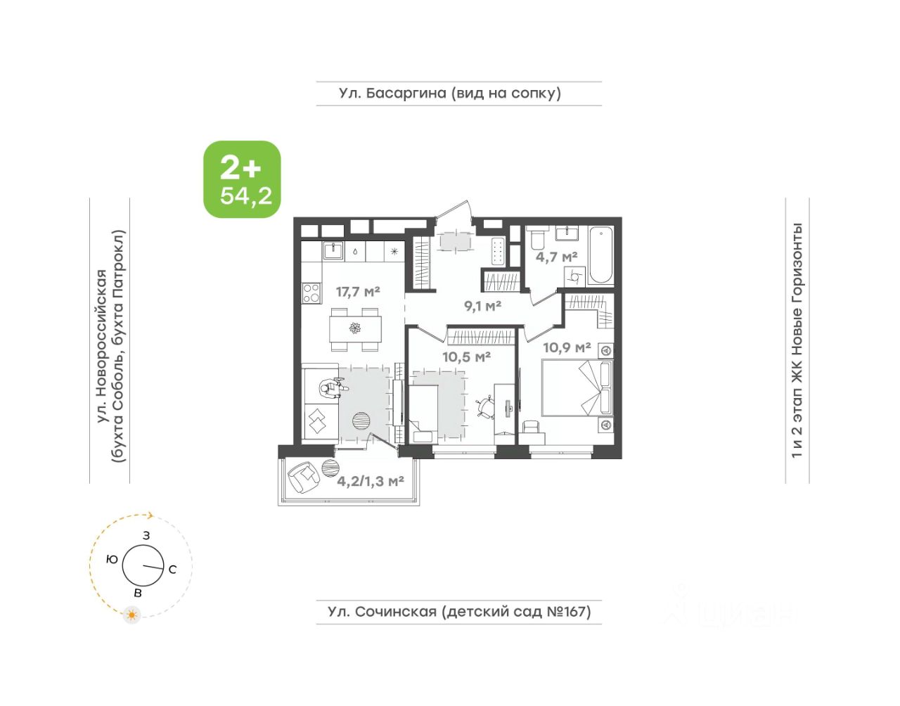 Коридор 9,1 кв.м. с пространствами для хранения с двух сторон, чтобы всем и всему хватило места Кухня-гостиная 17,7 кв.м. для времяпрепровождения всей семьи Балкон 4,2 кв.м. с видом на рассвет для душевных разговоров Детская 10,5 кв.м. хватит и для отдыха, и для продуктивной учёбы Спальня 10,9 кв.м. для вечернего расслабления и уединения от суеты В санузел 4,7 кв.м. поместится и просторная ванна, и стиральная машина