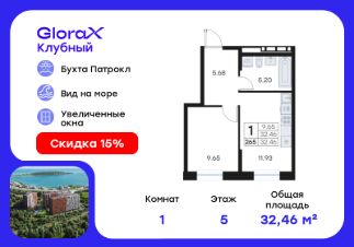 Продается 1-комн. квартира на 5-м этаже в квартале GloraX Клубный. GloraX Клубный - уникальный видовой проект с выделяющейся архитектурой в развитом районе Владивостока. Общая площадь лота составляет 32,46 кв. м, из которых 9,65 кв. м отведено под жилую и 11,93 кв. м под кухонную зону. Номер квартиры - 265.Преимущества квартиры:однокомнатная квартира.Преимущества проекта:• Квартиры с панорамными видами на бухту Патрокл, маяк Басаргина и остров Русский• Планировочные решения под любой жизненный сценарий от 23 до 67 м²• Гардеробные комнаты, увеличенные панорамные окна, просторные кухни-гостиные• Эксклюзивное благоустройство: продуманное зонирование, игровые и спортивные площадки, площадка для стритбола, амфитеатр• Премиальный дизайн входных групп с лаунж-зоной• Безбарьерная среда, закрытая территория, видеонаблюдение• Лапомойки, колясочные и туалеты на первом этаже• Двухуровневый подземный паркинг на 350 машино-мест с лифтом на жилые этажи• Келлеры на цокольном этаже для хранения сезонных вещей с доступом на лифте• Современный ландшафтный дизайн комплекса от DEREVOPARKGloraX Клубный заповедник в черте мегаполиса. Комплекс тщательно продуман для максимального удобства и обеспечения безопасности его жителей. Квартал расположен в одном из самых современных развивающихся районов города: совсем рядом раскинулась живописная бухта Патрокл, где можно прогуляться по облагороженной пешеходной набережной, заглянуть на пляж или в школу серфинга. Комплекс имеет прекрасную транспортную доступность: рядом проходит объездная трасса СеданкаПатрокл, а до центар можно доехать всего за 15 минут.Проект включает 3 монолитных корпуса, каждый из которых спроектирован с акцентом на комфорт, безопасность и современный образ жизни рядом с уникальной природой. Общий двор создает приватную территорию для житей комплекса.В комплексе предусмотрен двухуровневый подземный паркинг на 350 машино-мест с доступом прямо с жилых этажей. Паркинг оборудован современными системами видеонаблюдения, контроля въезда-выезда и пожаротушения. На цокольном этаже размещаются келлеры для хранения сезонных и габаритных вещей. Доступ к кладовым на лифте с жилых этажей. Современный ландшафтный дизайн жилого комплекса GloraX Клубный создан ведущей российской студией DEREVOPARK. Во дворе для детей всех возрастов предусмотрены различные игровые площадки с лазалками, батутами, качелями и песочницей. В центре расположен специальный ''зеленый остров'', где взрослые могут отдохнуть на качелях и гамаках в тени больших деревьев. Для любителей спорта предусмотрены две специальные спортивные площадки для настольного тенниса и стритбола — для зрителей тоже найдется место! А еще на территории комплекса будет дорожка для роллеров и любителей покататься на велосипеде, самокате или скейте.В шаговой доступности располагаются все необходимые объекты социальной и коммерческой инфраструктуры.Цена указана при 100% оплате или ст