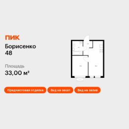 Продаётся 1-комн. квартира площадью 33,1 кв.м на 24 этаже 28 этажного дома (Корпус 2, Секция 2) проекта ПИК Борисенко 48. Светлый просторный подъезд на уровне земли, функциональная планировка, большие окна, предчистовая отделка. ''Борисенко 48'' - небольшой квартал в Первомайском районе, в 15 минутах пути на автомобиле от центра Владивостока. С верхних этажей откроется живописный вид на город и сопки. В проекте всего четыре дома и подземный паркинг, в который можно будет спуститься на лифте. Высота домов от 17 до 30 этажей - благодаря переменной этажности солнце будет лучше освещать двор и квартиры. На первых этажах откроются пекарни, кафе, магазины и другие сервисы - это удобно, когда внезапно закончится хлеб или захочется побаловать себя горячим кофе. Из каждого дома будет выход в уютный двор-парк - это закрытая территория для отдыха, где растут цветы и деревья, оборудованы детские и спортивные площадки. Рядом с ''Борисенко 48'' появится также детский сад для 150 малышей. В пешей доступности есть всё необходимое для комфортной жизни: школы, детские сады, поликлиника и магазины. До крупных торговых центров ''Калина Молл'' и ''Луговая'', а также супермаркета ''Реми'' - всего 5 минут на машине. А до озера на Сафонова, которое отлично подходит для прогулок и отдыха, можно дойти пешком за 9 минут. Живописная Леопардовая набережная - в 10 минутах на автомобиле. Из квартала можно будет выехать как на улицу Борисенко, так и на улицу Сафонова. Артикул 919369 (Застройщик ООО ''СЗ ''Юстина'')