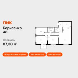 Продаётся 3-комн. квартира площадью 87,3 кв.м на 12 этаже 17 этажного дома (Корпус 3, Секция 3) проекта ПИК Борисенко 48. Светлый просторный подъезд на уровне земли, функциональная планировка, большие окна, предчистовая отделка. ''Борисенко 48'' - небольшой квартал в Первомайском районе, в 15 минутах пути на автомобиле от центра Владивостока. С верхних этажей откроется живописный вид на город и сопки. В проекте всего четыре дома и подземный паркинг, в который можно будет спуститься на лифте. Высота домов от 17 до 30 этажей - благодаря переменной этажности солнце будет лучше освещать двор и квартиры. На первых этажах откроются пекарни, кафе, магазины и другие сервисы - это удобно, когда внезапно закончится хлеб или захочется побаловать себя горячим кофе. Из каждого дома будет выход в уютный двор-парк - это закрытая территория для отдыха, где растут цветы и деревья, оборудованы детские и спортивные площадки. Рядом с ''Борисенко 48'' появится также детский сад для 150 малышей. В пешей доступности есть всё необходимое для комфортной жизни: школы, детские сады, поликлиника и магазины. До крупных торговых центров ''Калина Молл'' и ''Луговая'', а также супермаркета ''Реми'' - всего 5 минут на машине. А до озера на Сафонова, которое отлично подходит для прогулок и отдыха, можно дойти пешком за 9 минут. Живописная Леопардовая набережная - в 10 минутах на автомобиле. Из квартала можно будет выехать как на улицу Борисенко, так и на улицу Сафонова. Артикул 918731 (Застройщик ООО ''СЗ ''Юстина'')