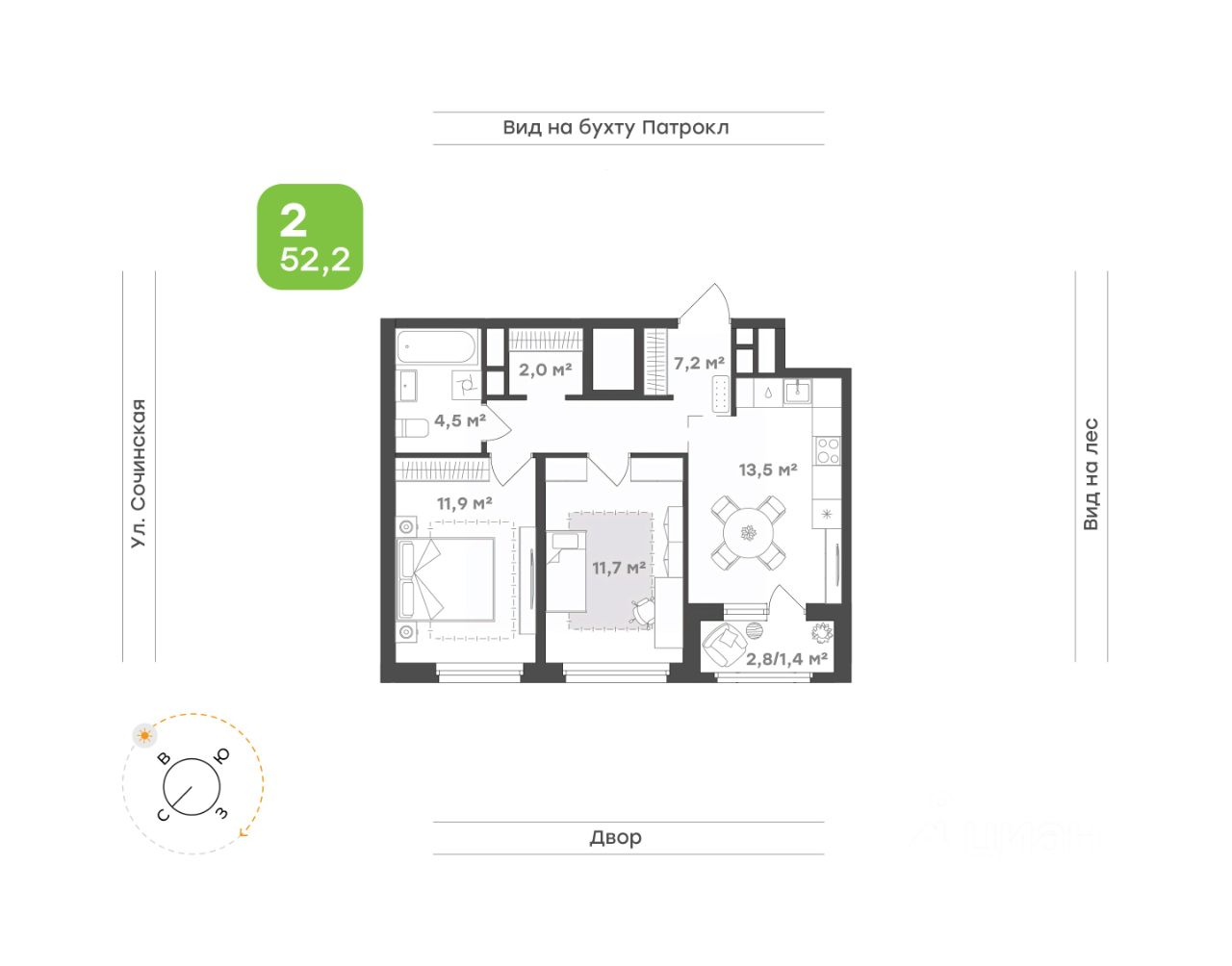 Продаётся 2-комнатная квартира в строящемся доме (Дом 1), срок сдачи: III-кв. 2027, общей площадью 45.58 кв.м., на 4 этаже. Новый жилой комплекс ''Архитектор'' от группы компаний ''Девелопмент-Юг'' расположен по адресу: г. Владивосток, по ул. Бежецкая.