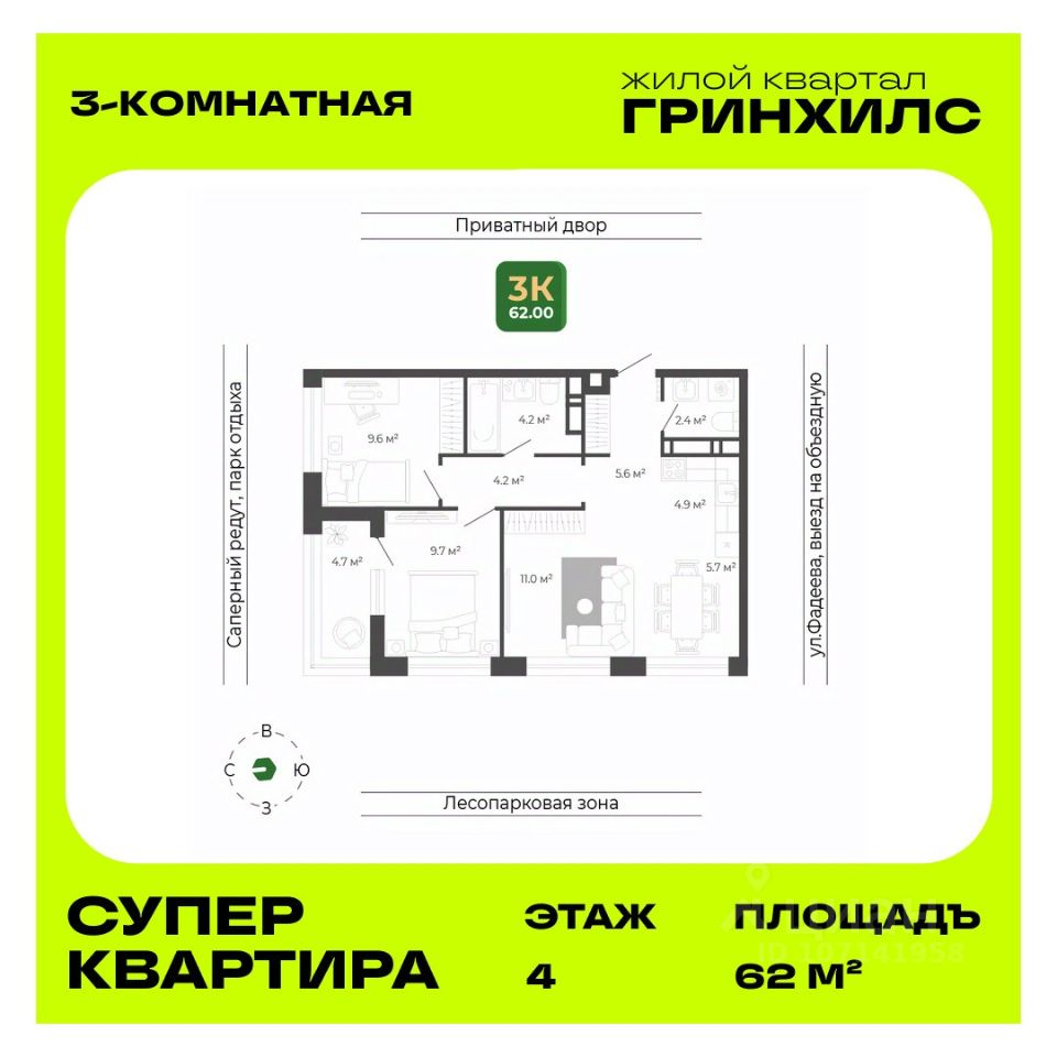 Продается 3-к квартира в ЖК ''Гринхилс''. Отделка - whitebox, санузел - под ключ.Общая площадь квартиры — 62 кв. м, этаж 4 из 18.Тип дома — монолитный.Цена указана при 100% оплате.ЖК ''Гринхилс'' — жилой квартал комфорт-класса в выгодной локации микрорайона Зеленый угол: развивающегося современного жилого кластера во Владивостоке, внутри которого реализуются проекты нового поколения, преобразуя город. Полный набор необходимой инфраструктуры, транспортная доступность, исторические места города в шаговой доступности, а также окружение леса — все это и есть современный Зеленый угол. ТРАНСПОРНАЯ ДОСТУПНОСТЬ - 15 минут до центра, - 17 минут до ж/д вокзала, - 10 мин до пляжа Патрокл*, - 30 минут до автовокзала, - 50 минут до аэропорта. *В конце 2025 года планируется ввод дороги, соединяющей район с объездной Седанка-ДеФриз-Патрокл. ПЛАНОВЫЙ ВВОД В ЭКСПЛУАТАЦИЮ - 1 корпуса — 2 квартал 2026 года, - 2 и 3 корпусов — 2 квартал 2027 года. АРХИТЕКРУРНЫЕ И ИНЖЕНЕРНЫЕ РЕШЕНИЯ, ПОВЫШАЮЩИЕ КАЧЕСТВО ЖИЗНИ - Приватный безопасный каскадный двор-парк площадью более 4000м2, спроектирован как отдельный архитектурный объект с зонами, включающими в себя целый комплекс оборудования для детей и взрослых, озеленением и современным освещением, благодаря которому будет приятно гулять и отдыхать во дворе в вечернее и ночное время, - Доступ на территорию всего ЖК только для вас и ваших гостей, - Видеонаблюдение по периметру всего ЖК, безбарьерный доступ в дом с обеих сторон и современная домофония, - Дизайнерская отделка мест общего пользования, чтобы было приятно каждый раз, когда приходишь к себе домой, - Предусмотрено место для консьержа, а также туалеты на первых этажах для вашего комфорта, - Колясочные и три современных лифта c прямым доступом к индивидуальным кладовым и паркингу, - Трехэтажный приватный паркинг в 3-м корпусе: широкие проезды, индивидуальные машиноместа, безопасное и комфортное хранение вашего автопарка. МНОЖЕСТВО ПЛАНИРОВОЧНЫХ РЕШЕНИЙ И ВАРИАНТОВ ОТДЕЛКИ - Студии, 1к, 2к, 3к, 4к и квартиры евро-формата спроектированных по стандарту ''Эргом2етрика'', учитывающие различные сценарии жизни. Для вашего удобства для каждого варианта планировки вы можете выбрать подходящую готовности квартиры: - Без отделки, - Без отделки с выполненной стяжкой пола, - Whitebox — квартира, готовая к декорированию: стены подготовлены дя отделки, проведена электрика с учетом рекомендаций по расстановке мебели и бытовой техники, выровнен пол, в каждой квартире установлена взломостойкая входная дверь, - Whitebox plus — квартира, готовая к декорированию, в которой выполнена полностью отделка санузла, - Квартира с полностью готовой современной отделкой в светлых тонах. Во всех квартирах лоджии имеют панорамное остекление. Для вашего удобства в 1м корпусе открыт демонстрационный этаж, где вы сможете вживую увидеть все варианты отделок квартир. Записывайтесь на показ по контактам в этом объявлении.