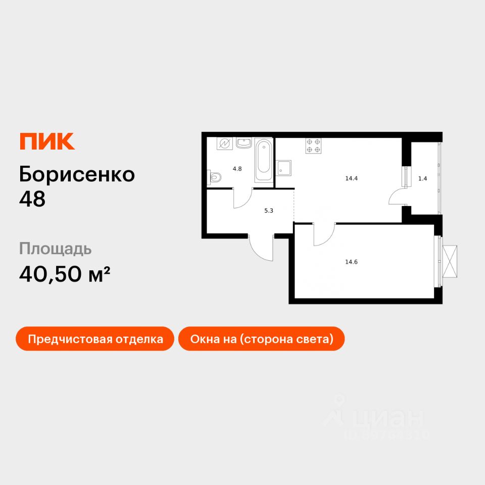 Продаётся 1-комн. квартира площадью 40,5 кв.м на 28 этаже 28 этажного дома (Корпус 2, Секция 2) проекта ПИК Борисенко 48. Светлый просторный подъезд на уровне земли, функциональная планировка, большие окна, предчистовая отделка.