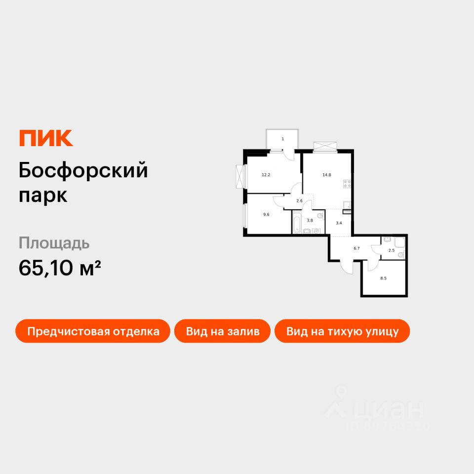 Продаётся 2-комн. квартира площадью 65,1 кв.м на 17 этаже 17 этажного дома (Корпус 5, Секция 1) проекта ПИК Босфорский парк. Светлый просторный подъезд на уровне земли, функциональная планировка, большие окна, предчистовая отделка.