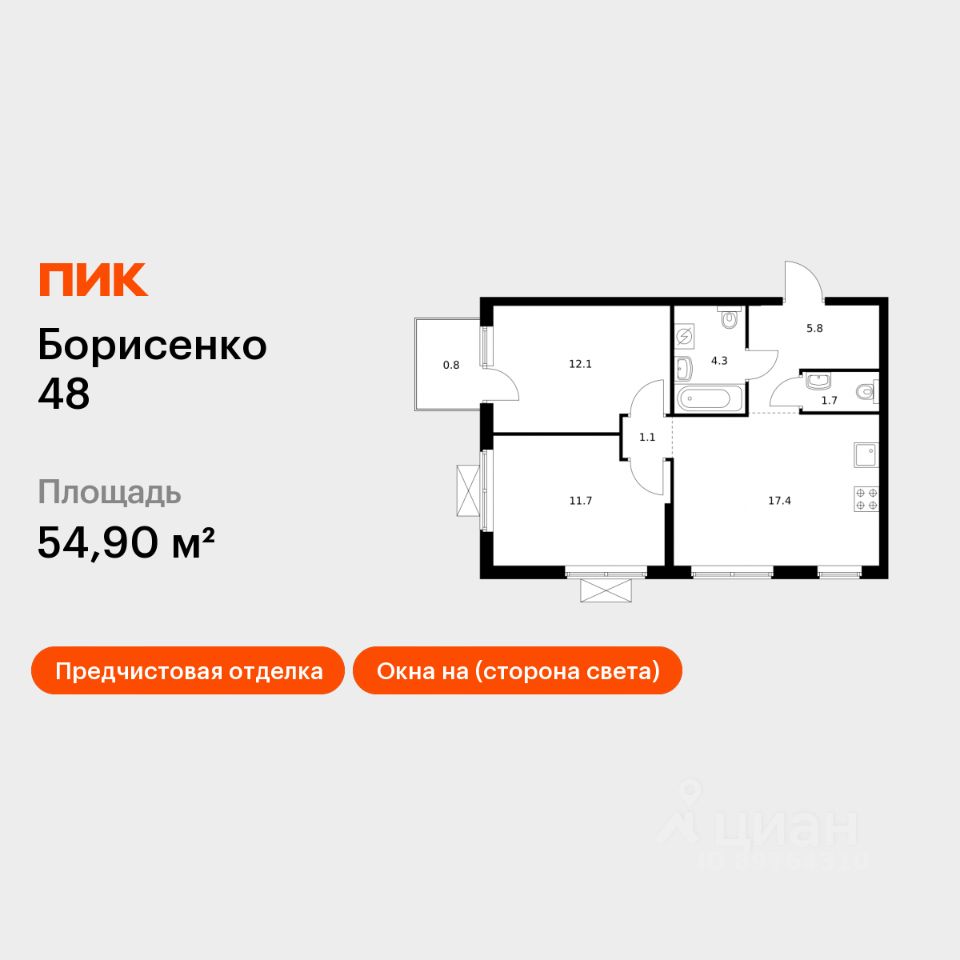 Продаётся 2-комн. квартира площадью 54,9 кв.м на 11 этаже 17 этажного дома (Корпус 3, Секция 3) проекта ПИК Борисенко 48. Светлый просторный подъезд на уровне земли, функциональная планировка, большие окна, предчистовая отделка.