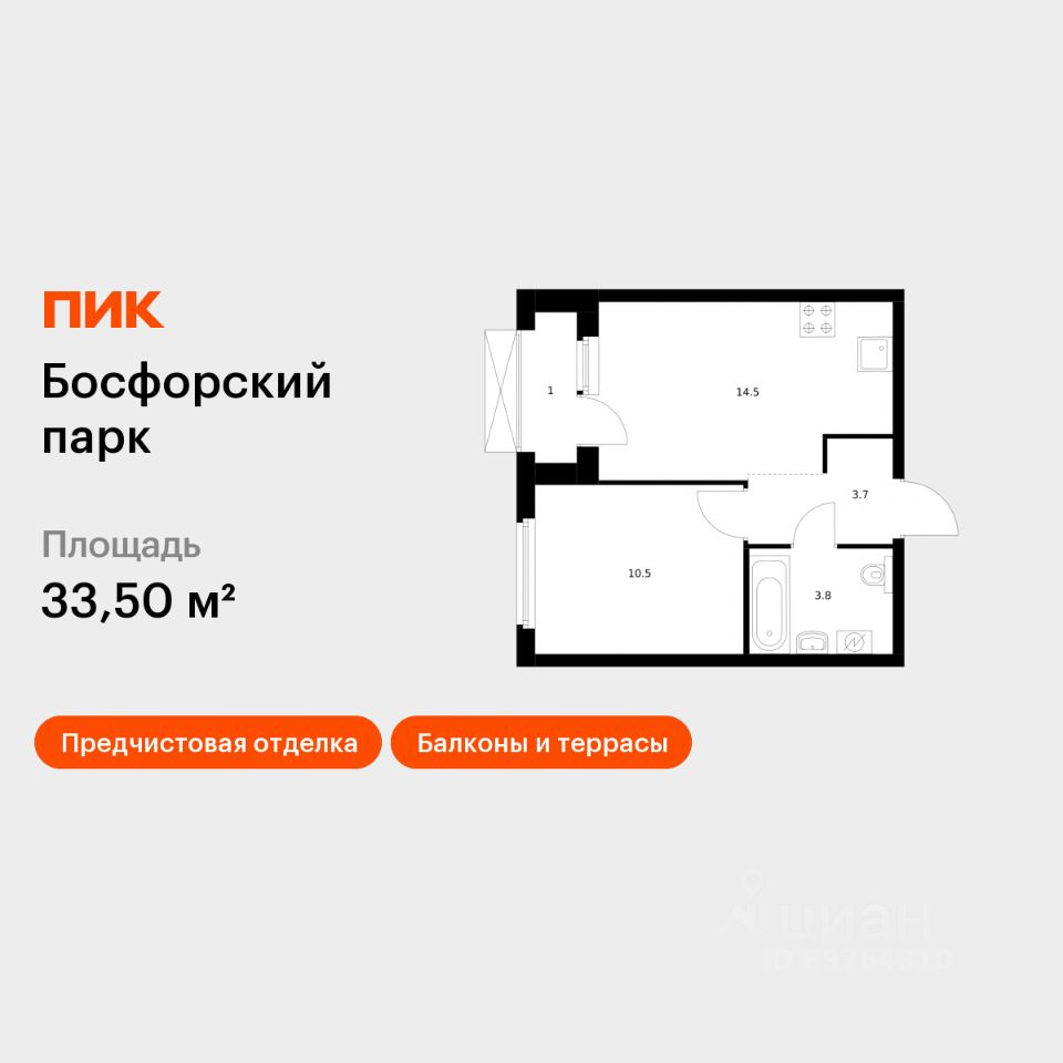 Продаётся 1-комн. квартира площадью 33,5 кв.м на 9 этаже 17 этажного дома (Корпус 5, Секция 1) проекта ПИК Босфорский парк. Светлый просторный подъезд на уровне земли, функциональная планировка, большие окна, предчистовая отделка.