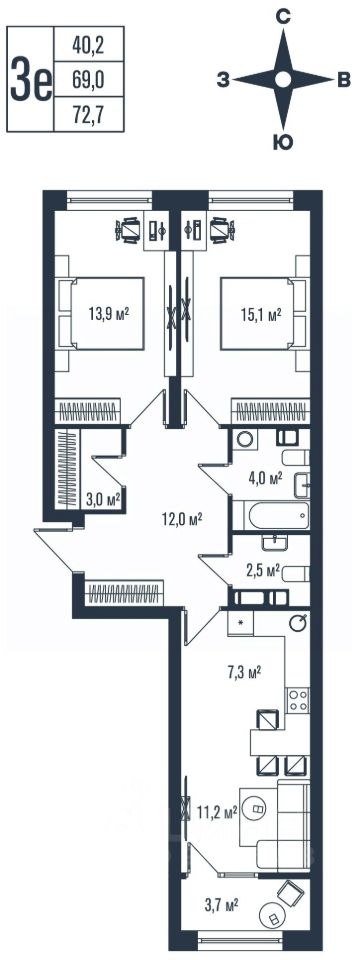 Продаётся 3-комнатная квартира в сданном доме (Дом 2), срок сдачи: IV-кв. 2025, общей площадью 72.7 кв.м., на 12 этаже. Новый жилой комплекс ''Футурист'' от застройщика ''СИК Девеломпент-юг'' расположен по адресу город Владивосток, улица Карбышева.