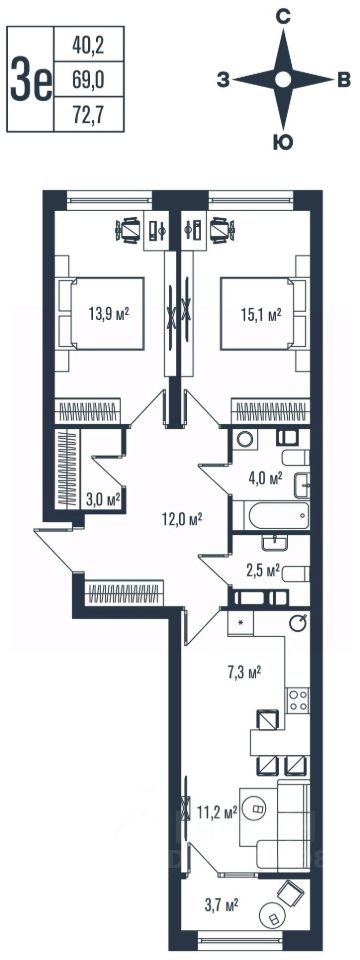 Продаётся 3-комнатная квартира в сданном доме (Дом 2), срок сдачи: IV-кв. 2025, общей площадью 72.7 кв.м., на 13 этаже. Новый жилой комплекс ''Футурист'' от застройщика ''СИК Девеломпент-юг'' расположен по адресу город Владивосток, улица Карбышева.