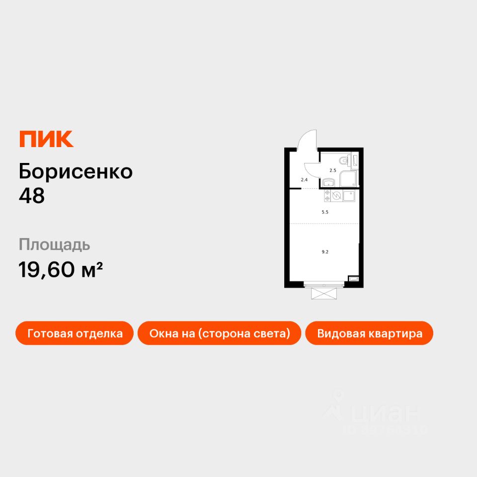 Продаётся квартира-студия площадью 19,6 кв.м на 11 этаже 30 этажного дома (Корпус 4, Секция 4) проекта ПИК Борисенко 48. Светлый просторный подъезд на уровне земли, функциональная планировка, большие окна, c отделкой.