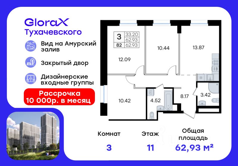 Продается 3-комн. квартира на 11-м этаже в жилом комплексе GloraX Тухачевского — современном проекте нового формата в престижном районе Владивостока. Общая площадь лота составляет 62,93 кв. м, из которых 33,20 кв. м отведено под жилую и 13,87 кв. м под кухонную зону. Номер квартиры - 82.