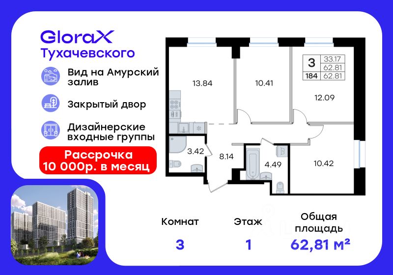 Продается 3-комн. квартира на 1-м этаже в жилом комплексе GloraX Тухачевского — современном проекте нового формата в престижном районе Владивостока. Общая площадь лота составляет 62,81 кв. м, из которых 33,17 кв. м отведено под жилую и 13,84 кв. м под кухонную зону. Номер квартиры - 184.