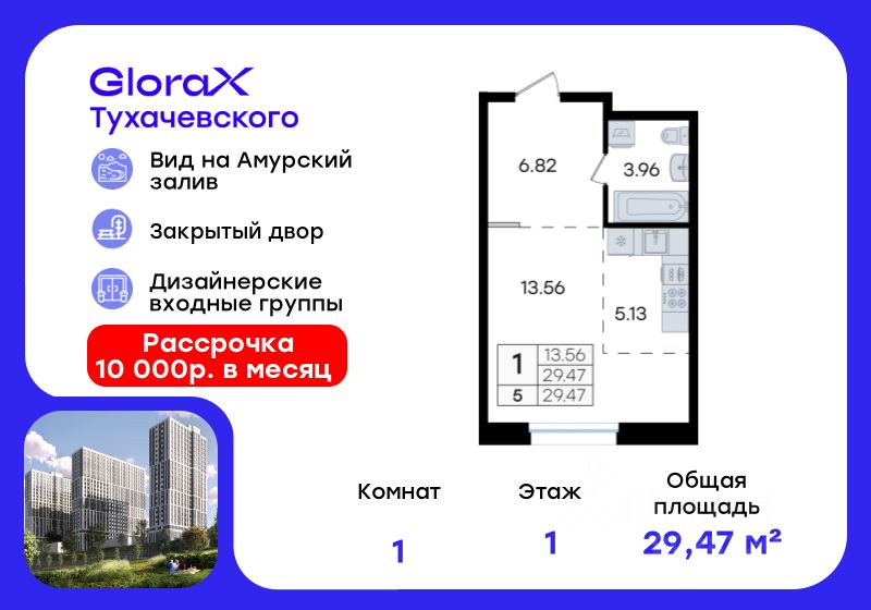 Продается квартира-студия на 1-м этаже в жилом комплексе GloraX Тухачевского — современном проекте нового формата в престижном районе Владивостока. Общая площадь лота составляет 29,47 кв. м, из которых 13,56 кв. м отведено под жилую и 5,13 кв. м под кухонную зону. Номер квартиры - 5.