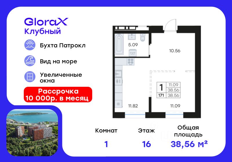 Продается 1-комн. квартира на 16-м этаже в квартале GloraX Клубный. GloraX Клубный - уникальный видовой проект с выделяющейся архитектурой в развитом районе Владивостока. Общая площадь лота составляет 38,56 кв. м, из которых 11,09 кв. м отведено под жилую и 11,82 кв. м под кухонную зону. Номер квартиры - 171.
