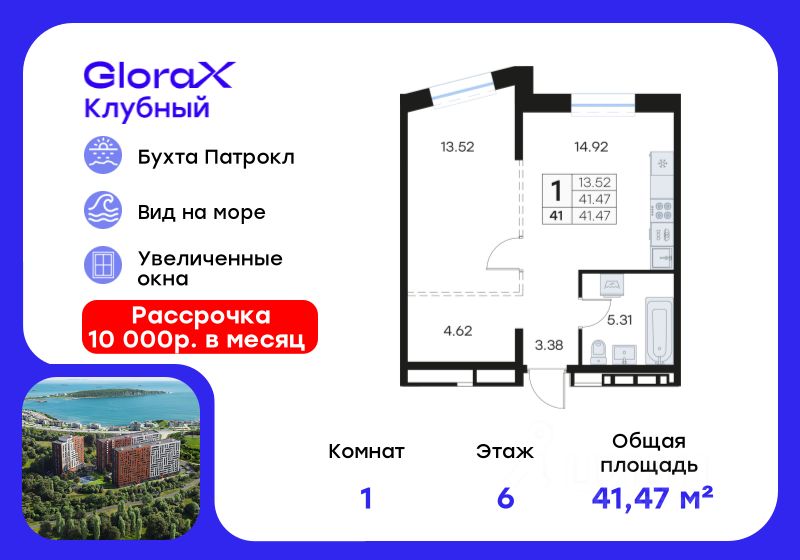 Продается 1-комн. квартира на 6-м этаже в квартале GloraX Клубный. GloraX Клубный - уникальный видовой проект с выделяющейся архитектурой в развитом районе Владивостока. Общая площадь лота составляет 41,47 кв. м, из которых 13,52 кв. м отведено под жилую и 14,92 кв. м под кухонную зону. Номер квартиры - 41.