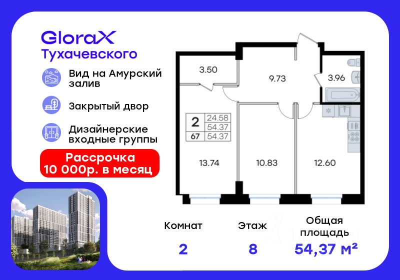 Продается 2-комн. квартира на 8-м этаже в жилом комплексе GloraX Тухачевского — современном проекте нового формата в престижном районе Владивостока. Общая площадь лота составляет 54,37 кв. м, из которых 24,58 кв. м отведено под жилую и 12,60 кв. м под кухонную зону. Номер квартиры - 67.