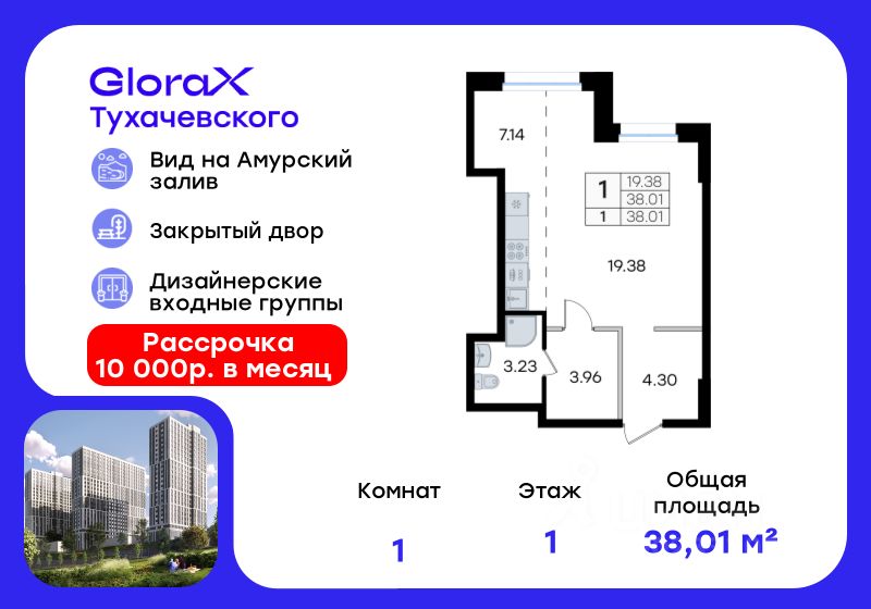 Продается квартира-студия на 1-м этаже в жилом комплексе GloraX Тухачевского — современном проекте нового формата в престижном районе Владивостока. Общая площадь лота составляет 38,01 кв. м, из которых 19,38 кв. м отведено под жилую и 7,14 кв. м под кухонную зону. Номер квартиры - 1.