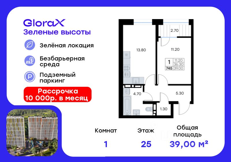 Продается 1-комн. квартира на 25-м этаже в жилом квартале GloraX Зелёные высоты — проекте в тихой зелёной локации. Общая площадь квартиры 39,00 кв. м, из которых 11,20 кв. м включая 11,20 кв. м жилого пространства и 13,80 кв. м кухни. Номер квартиры - 745.