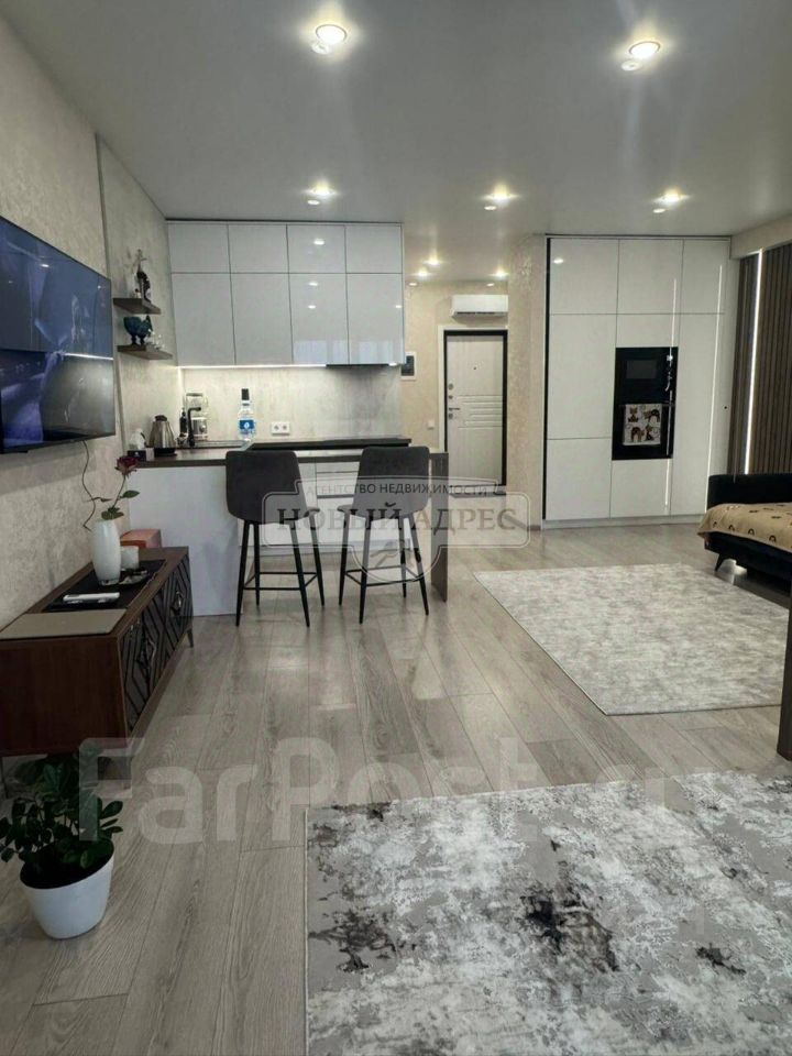 * Просторная, светлая кухня-гостиная. Глянцевая белая кухня-это современное, стильное и функциональное решение, которое визуально расширяет пространство, наполняя его светом. Холодильник, духовой шкаф, микроволновая печь и посудомоечная машина скрыты за фасадами для единой плоскости. Также в кухонный гарнитур встроена вытяжка. * Гостиная в светлых оттенках, которые сочетаются с кухней. Минималистичный диван в теплой гамме, подвесной телевизор, а также полка под телевизором в черных оттенках. * Отдельно выделенная спальная зона, с двуспальней кроватью в теплых оттенках, с выходом на лоджию. *Светлый функциональный санузел: душевая кабинка, подвесной унитаз, титан, стиральная машина. *Из квартиры открывается красивый вид на мост Русский. * Квартира находится в районе с развитой инфраструктурой. В шаговой доступности детский сад, школы, аптеки, магазины, а также остановки общественного транспорта. Хорошая транспортная доступность в любой район города. До центра Владивостока на машине 10 минут.