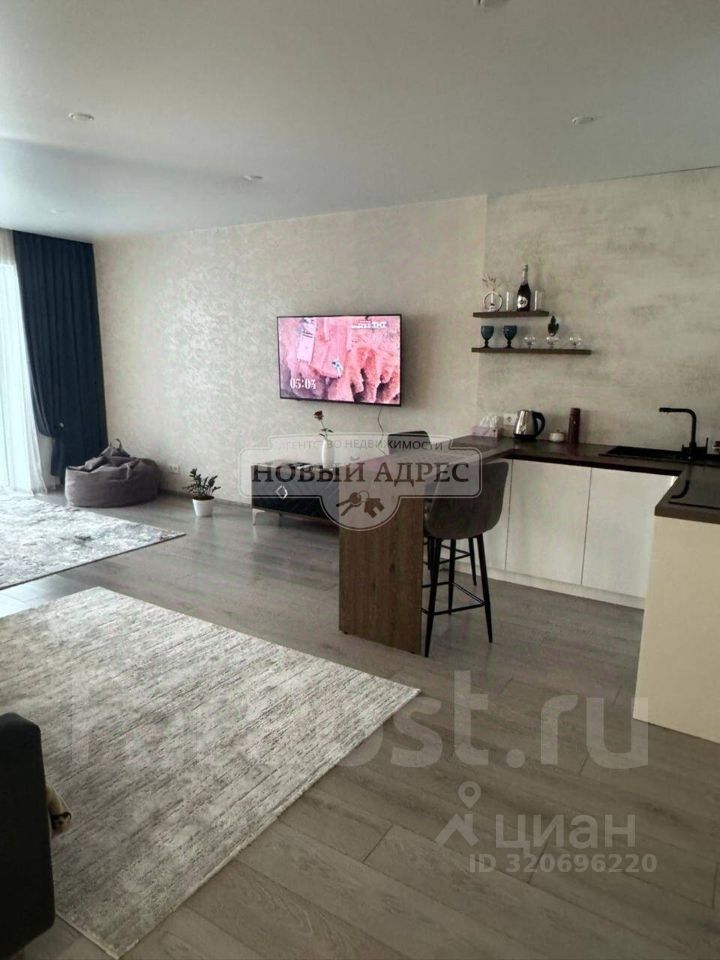 * Просторная, светлая кухня-гостиная. Глянцевая белая кухня-это современное, стильное и функциональное решение, которое визуально расширяет пространство, наполняя его светом. Холодильник, духовой шкаф, микроволновая печь и посудомоечная машина скрыты за фасадами для единой плоскости. Также в кухонный гарнитур встроена вытяжка. * Гостиная в светлых оттенках, которые сочетаются с кухней. Минималистичный диван в теплой гамме, подвесной телевизор, а также полка под телевизором в черных оттенках. * Отдельно выделенная спальная зона, с двуспальней кроватью в теплых оттенках, с выходом на лоджию.