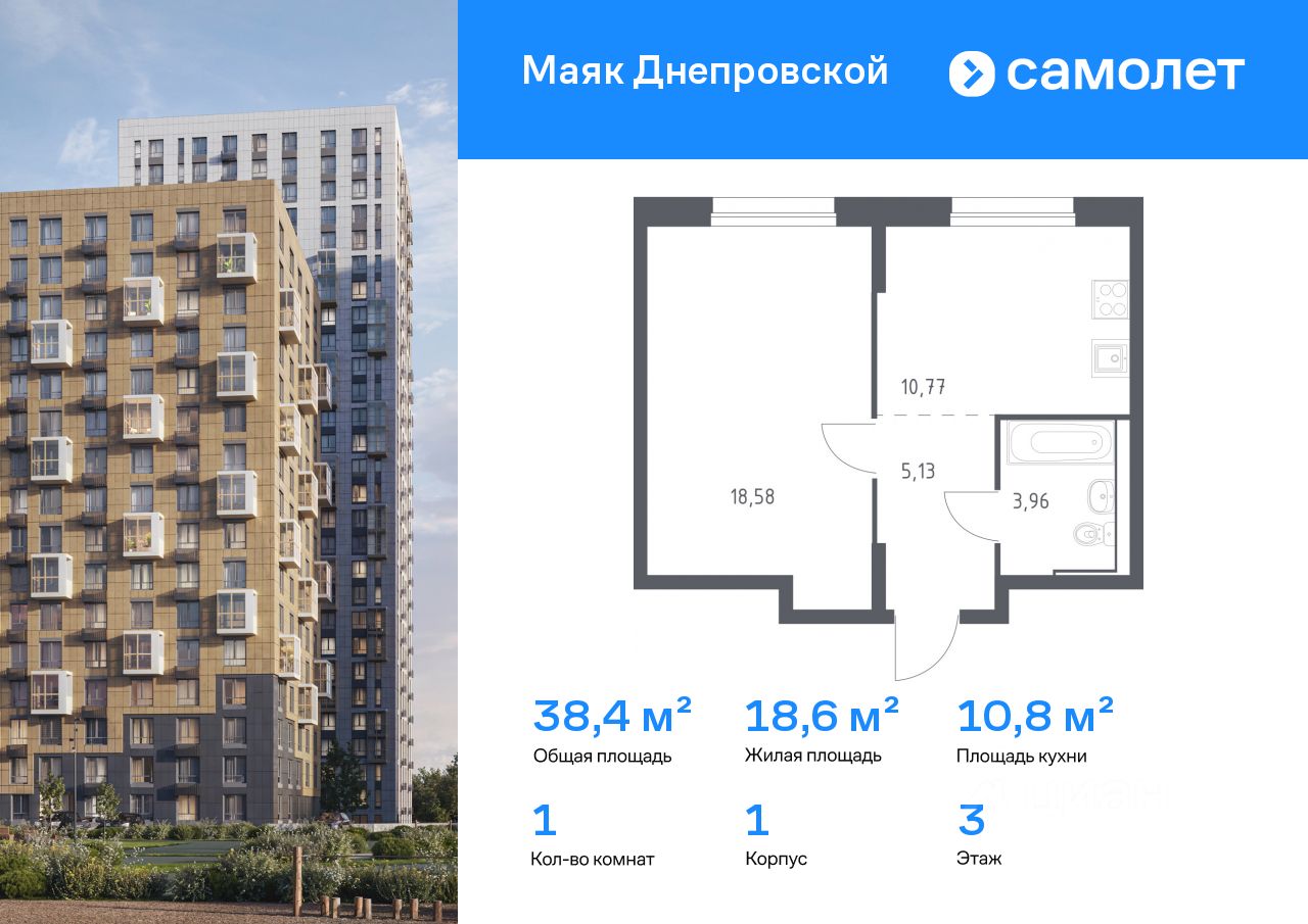 Предлагается 1-комнатная квартира комфорт-класса 38,44 кв.м в корпусе 1 на 3 этаже, в ЖК ''Маяк Днепровской'' Квартира с чистовой отделкой. Доступность дополнительных опций уточняйте у застройщика.