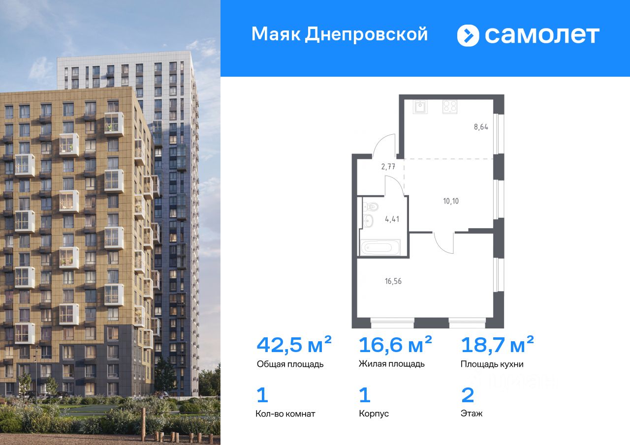 Предлагается 1-комнатная квартира комфорт-класса 42,48 кв.м в корпусе 1 на 2 этаже, в ЖК ''Маяк Днепровской'' Квартира с чистовой отделкой. Доступность дополнительных опций уточняйте у застройщика.