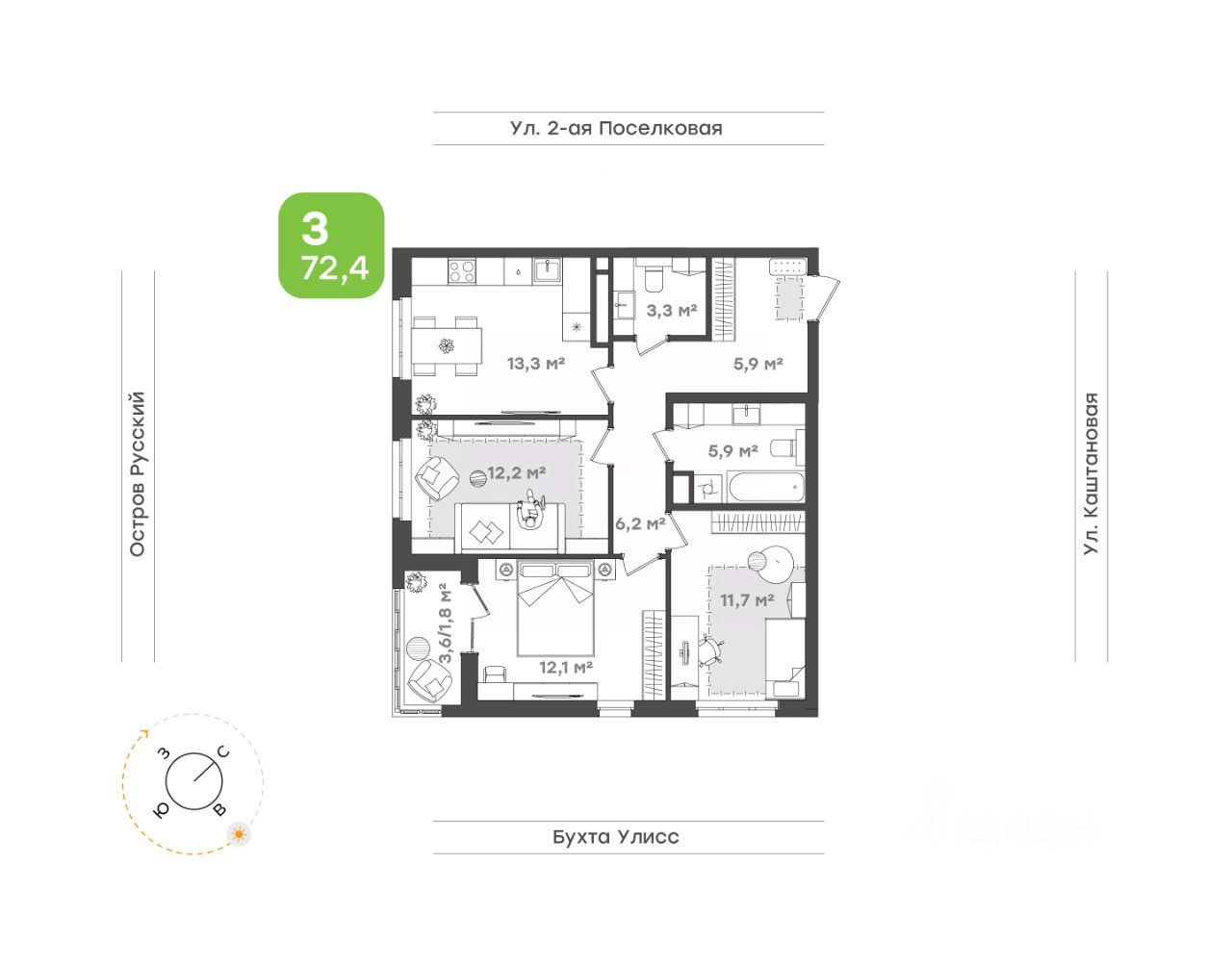 Классическая трехкомнатная квартира для большой семьи Просторная прихожая 5,9 кв.м с местом для шкафа и зоной для обуви Кухня 13,3 кв.м для семейных завтраков и ужинов Гостиная 12,2 кв.м с домашним кинотеатром станет местом отдыха и сбора гостей Родительская спальня 12,1 кв.м с выходом на лоджию для романтических вечеров Детская 11,7 кв.м идеальное место для вашего ребенка, чтобы играть и развиваться Два санузла для удобства и экономии времени всей семьи