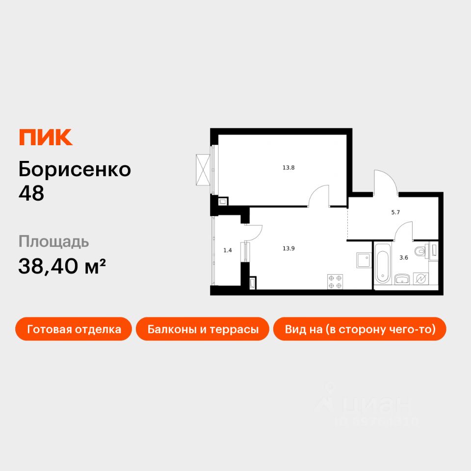 Продаётся 1-комн. квартира площадью 38,4 кв.м на 4 этаже 30 этажного дома (Корпус 4, Секция 4) проекта ПИК Борисенко 48. Светлый просторный подъезд на уровне земли, функциональная планировка, большие окна, c отделкой.